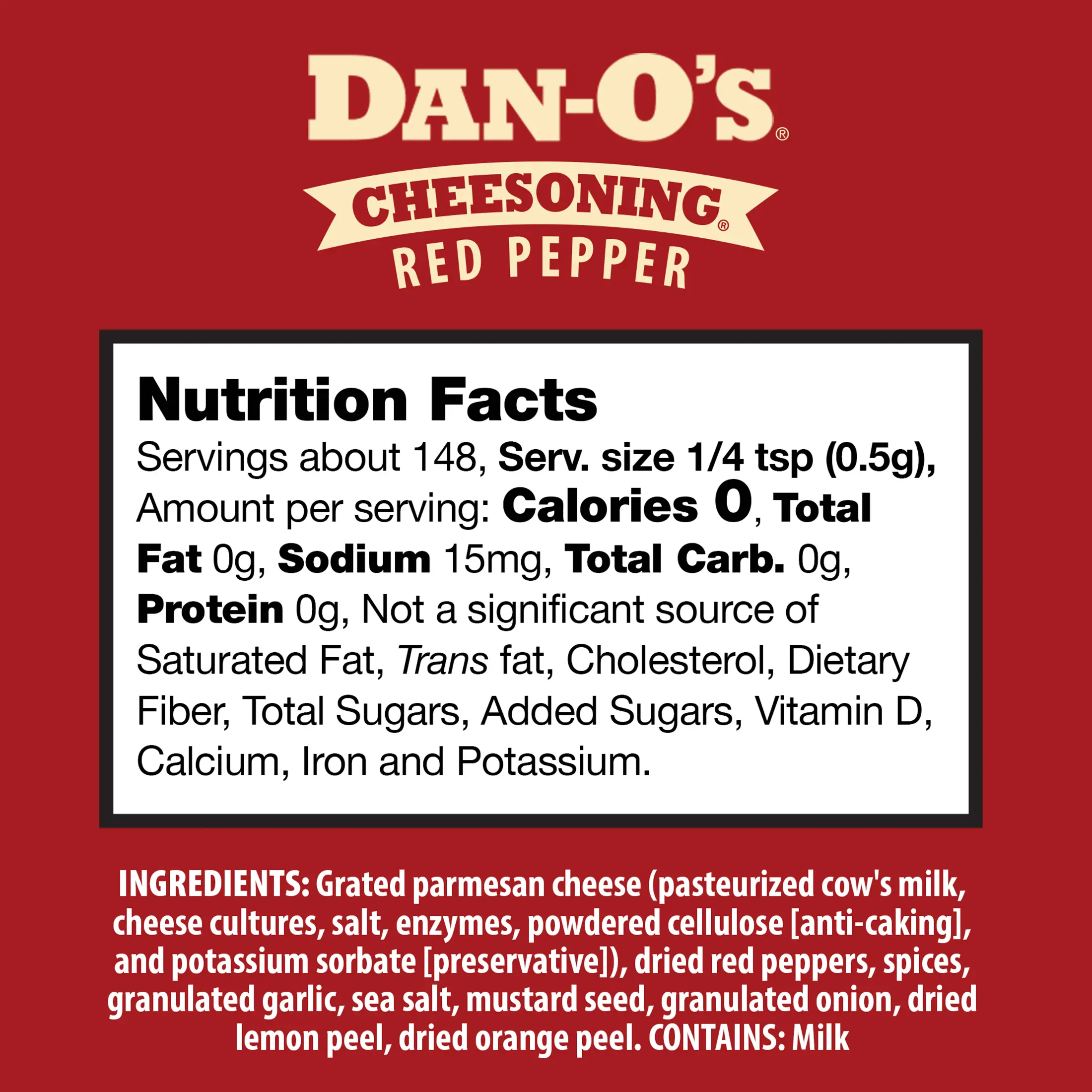 ·Red Pepper Twist: Forget the shaker of plain old red pepper flakes; Dan-O's Red Pepper Cheesoning elevates your Italian recipes with a punch of flavor as bold as it is delicious.