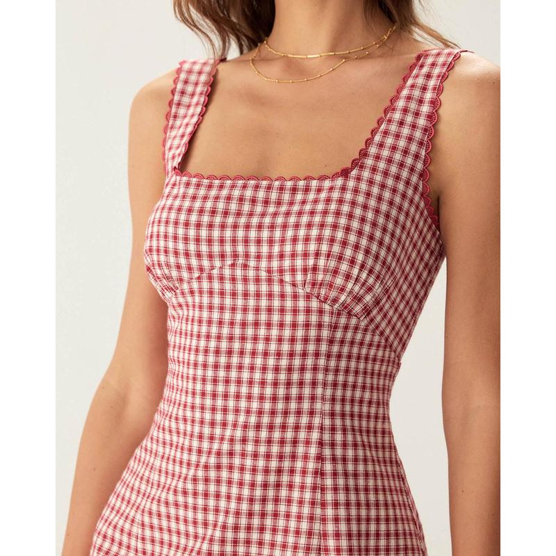 Description: Featuring a flattering square neckline, this dress highlights the collarbone and adds a structured yet feminine touch. The classic red plaid pattern brings a timeless appeal, while the slip-style silhouette ensures a sleek and effortless fit.