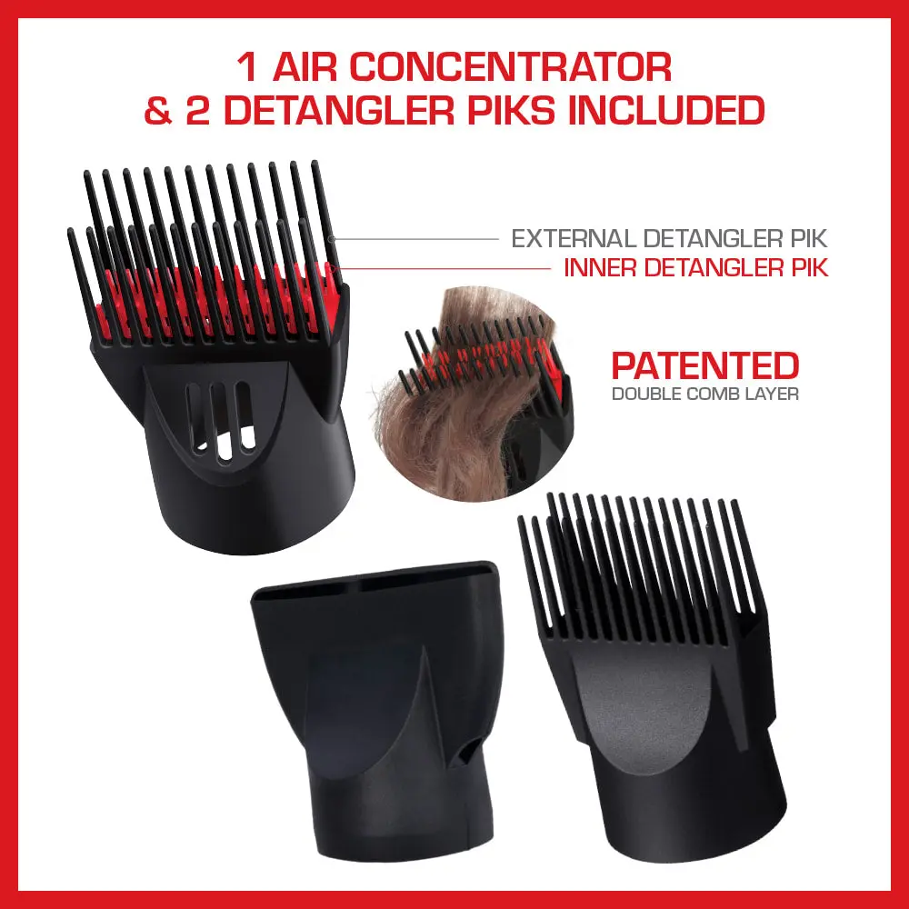 ·3 Bonus attachments - 1 Patented Double Layered Detangler Pik, 1 Single Layered Detangler Pik, 1 Air Concentrator