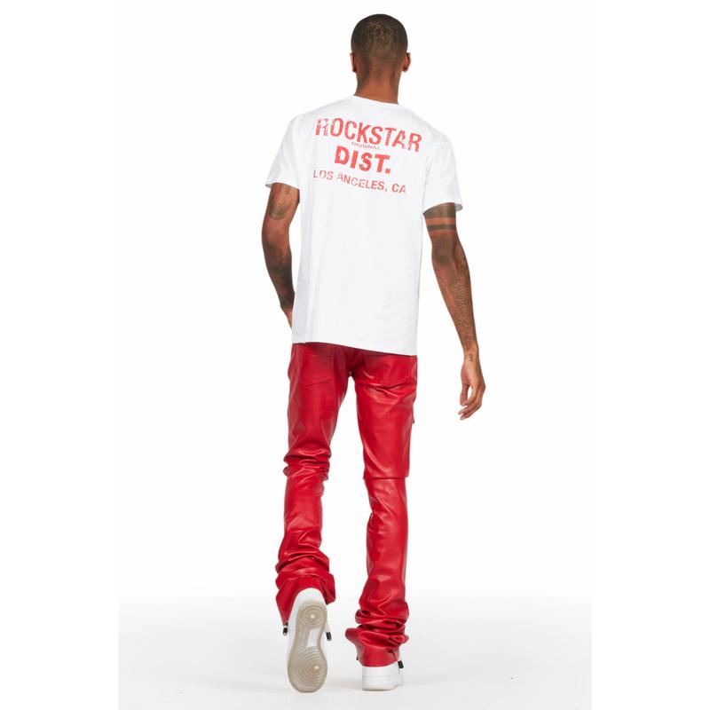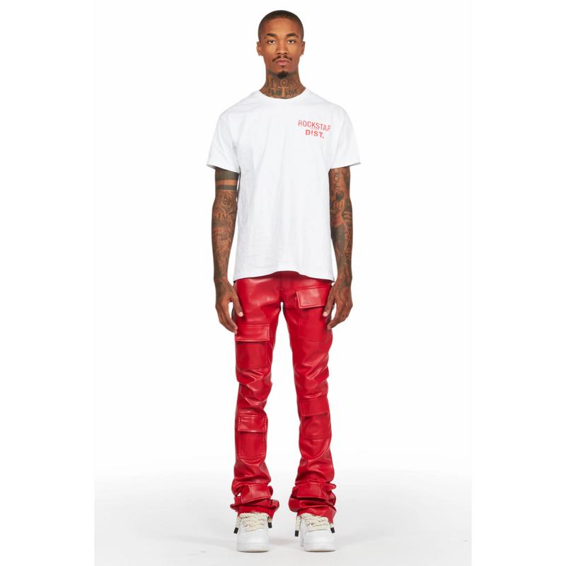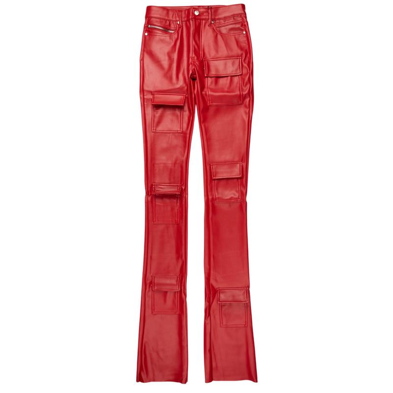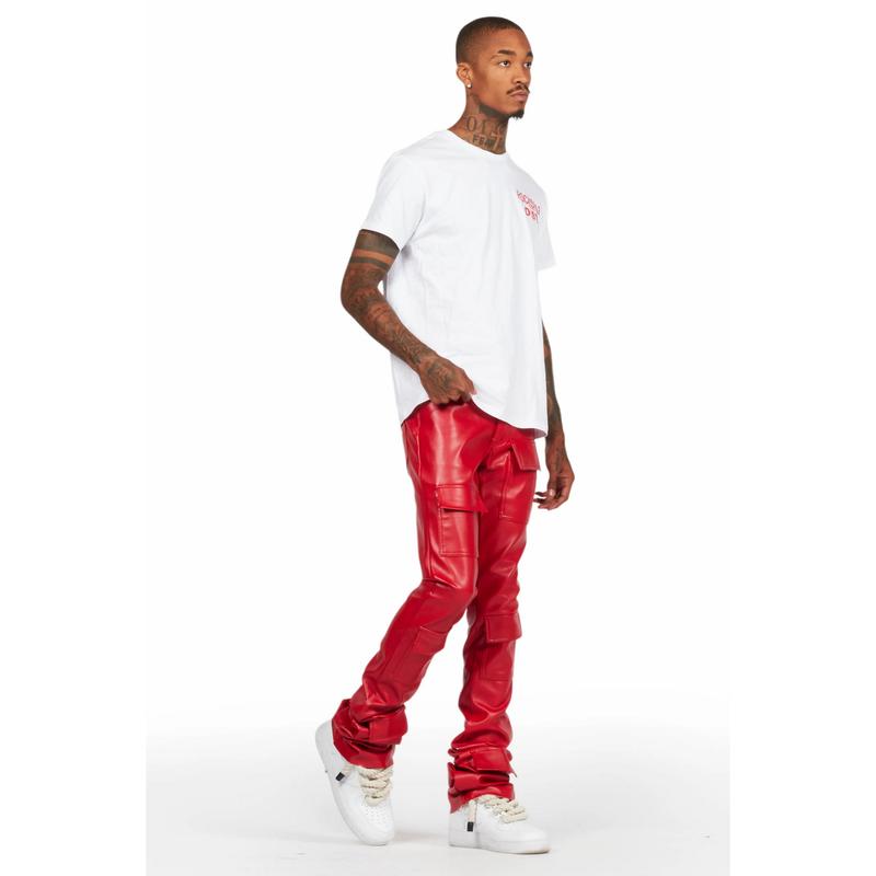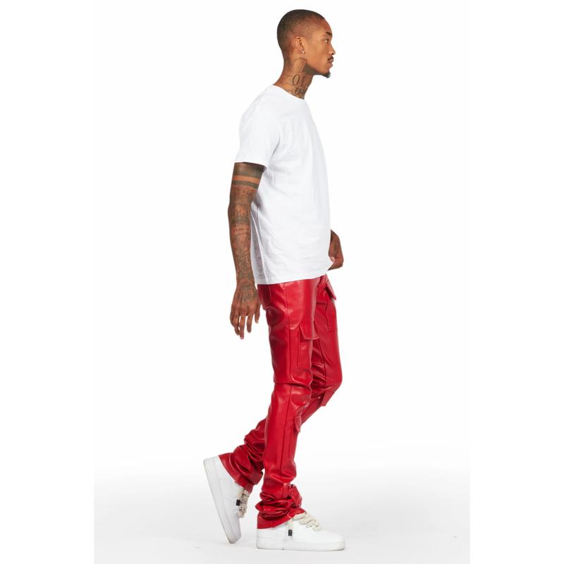 An urban stack cargo jean for men red. Designed with faux leather fabric and utility pockets for a dope denim streetwear style.