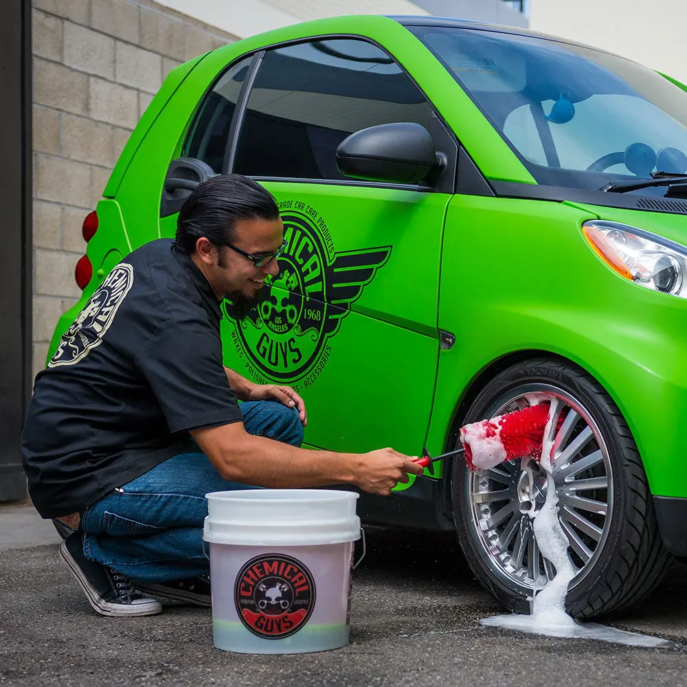 Rinse away loose contamination by spraying the face and barrel down with your favorite Chemical Guys wheel cleaner. Use the soft brush to easily scrub filth from deep inside wheel barrels, around cracks, between spokes, and through crevices. Once contamination is suspended in the cleaner, simply rinse it away with water.