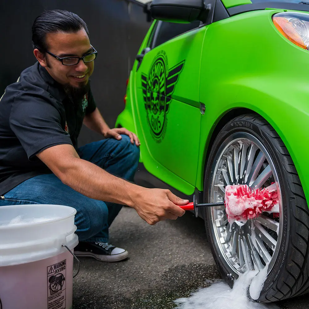 The innovative Red Rocket Brush uses a unique flexible spine that allows you to clean even the most inconvenient areas. Simply bend the brush to the desired angle, or insert into any small space and let the brush flex and conform to scrub 100% of the surface. Use the 9” brush on wheels, rims, brakes, and the smaller 5.5” on grilles, vents, exhaust pipes, and more.