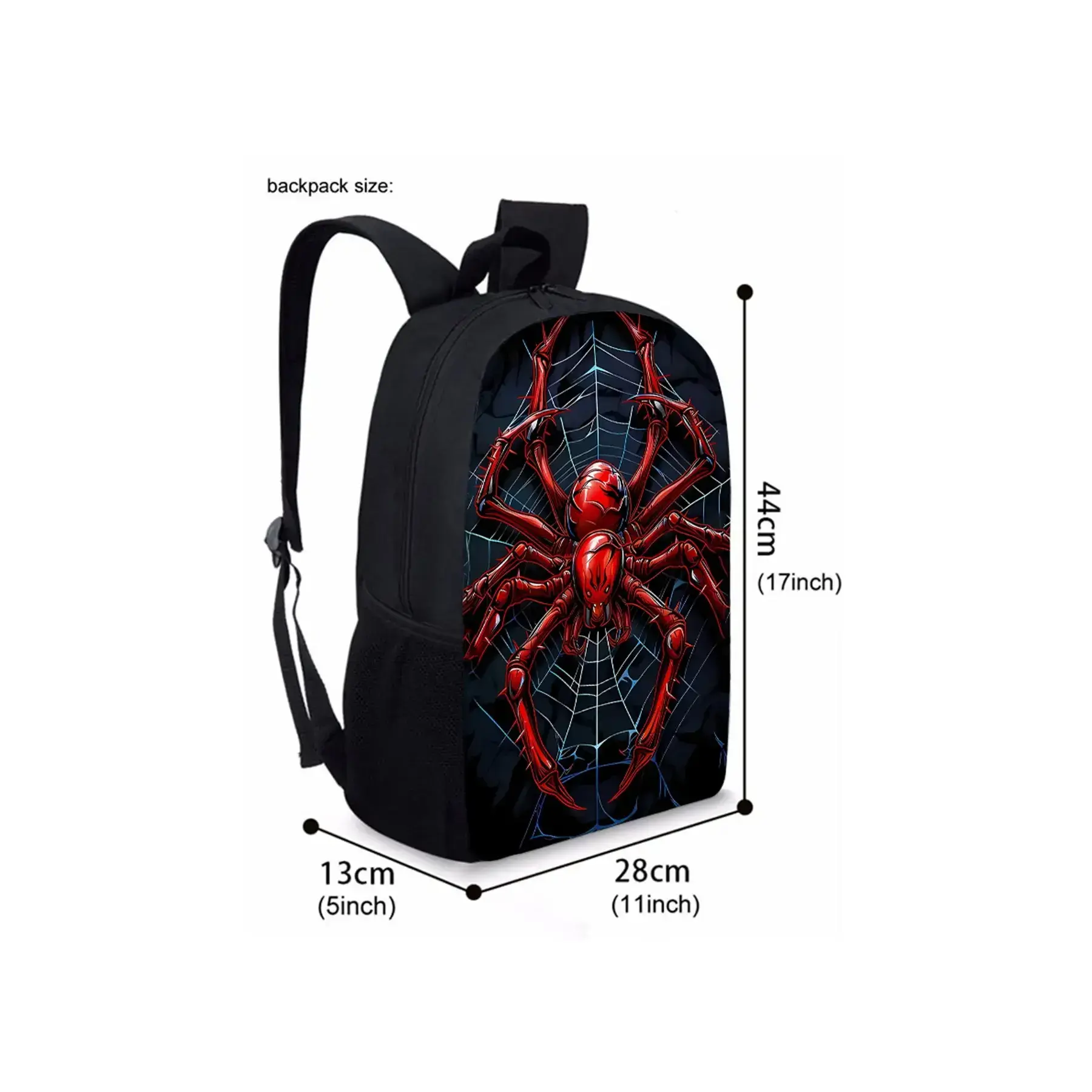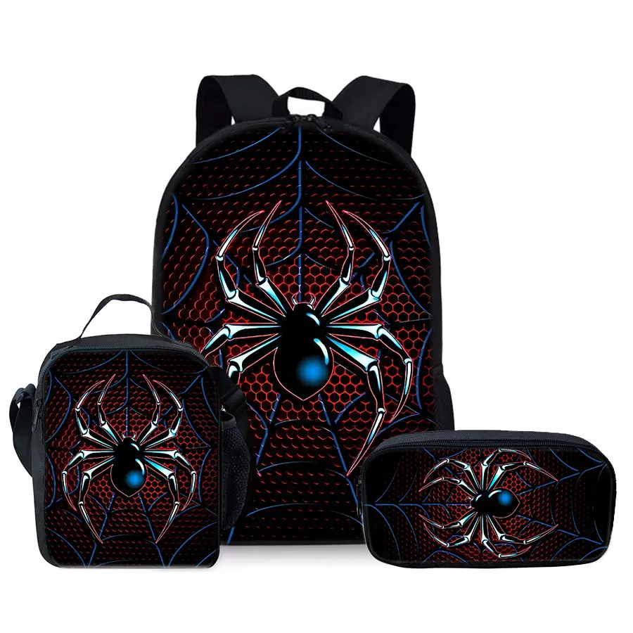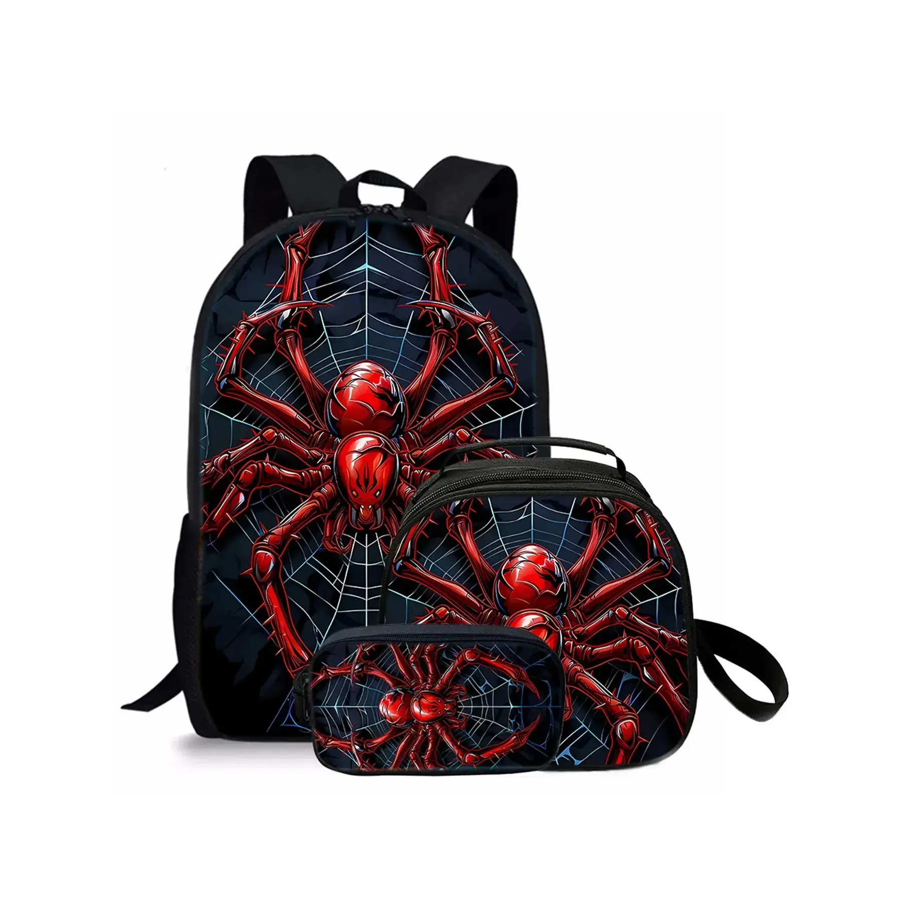 Red spider pattern printed 17-inch backpack for school three-piece set (single-layer backpack + shoulder strap round lunch bag + single-layer pencil bag)