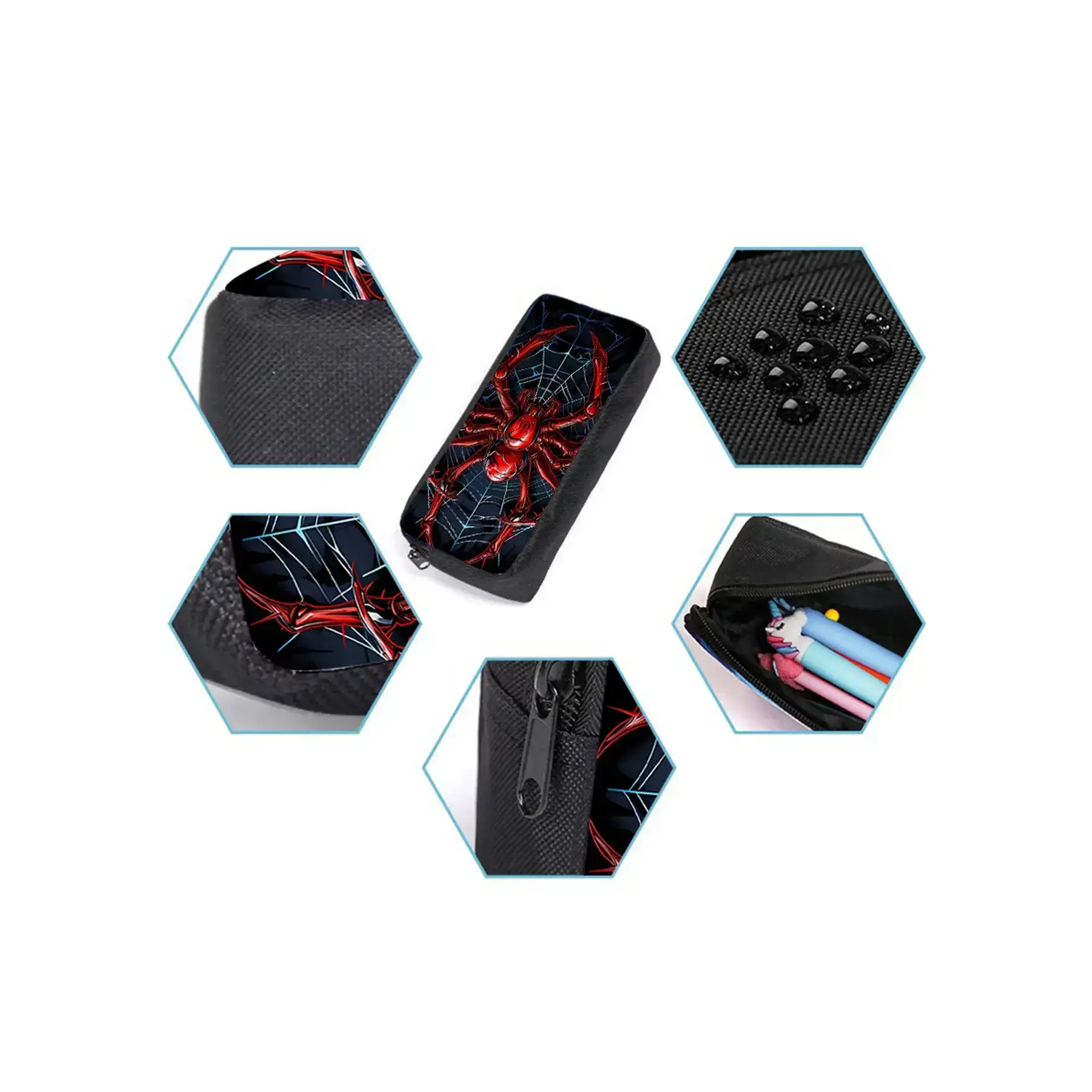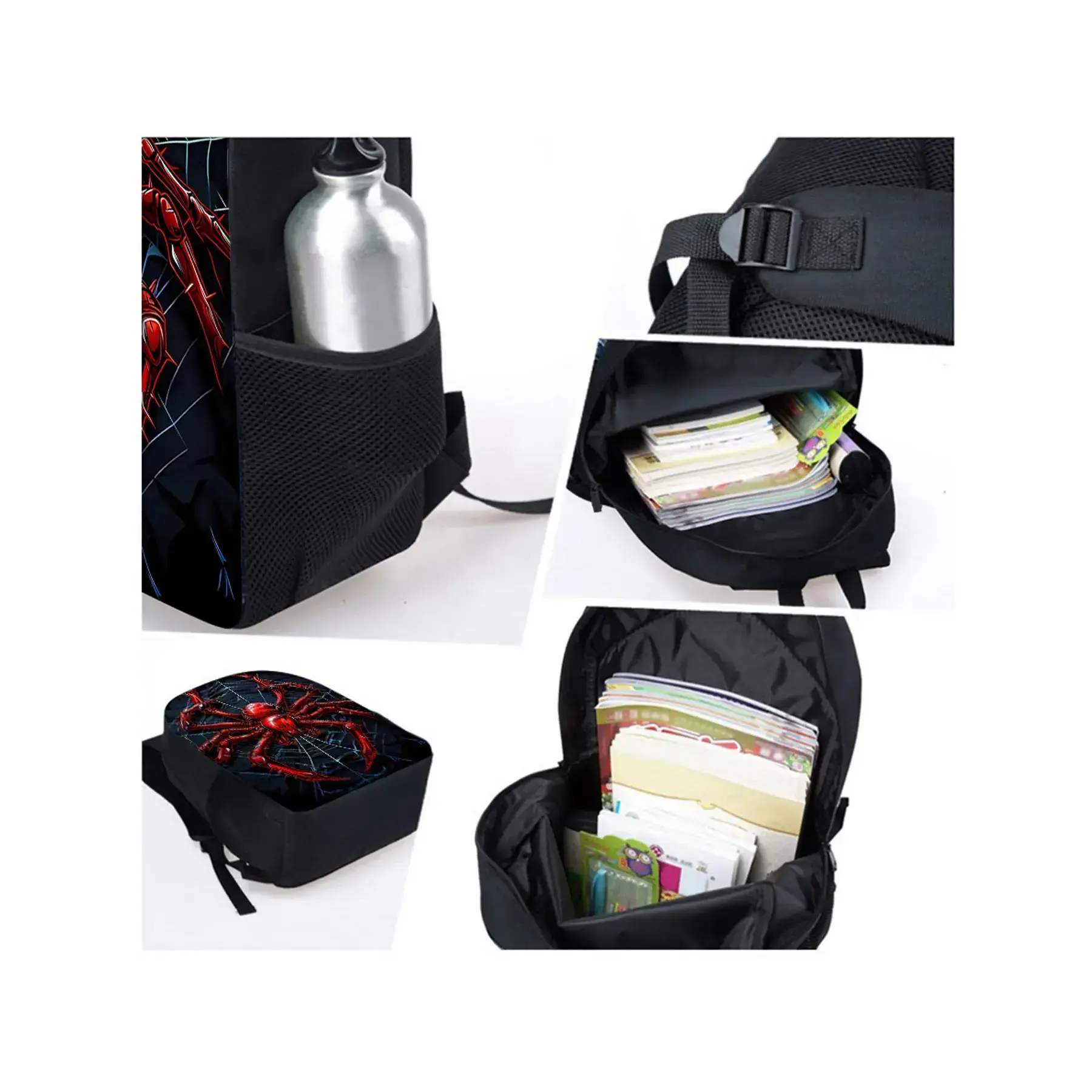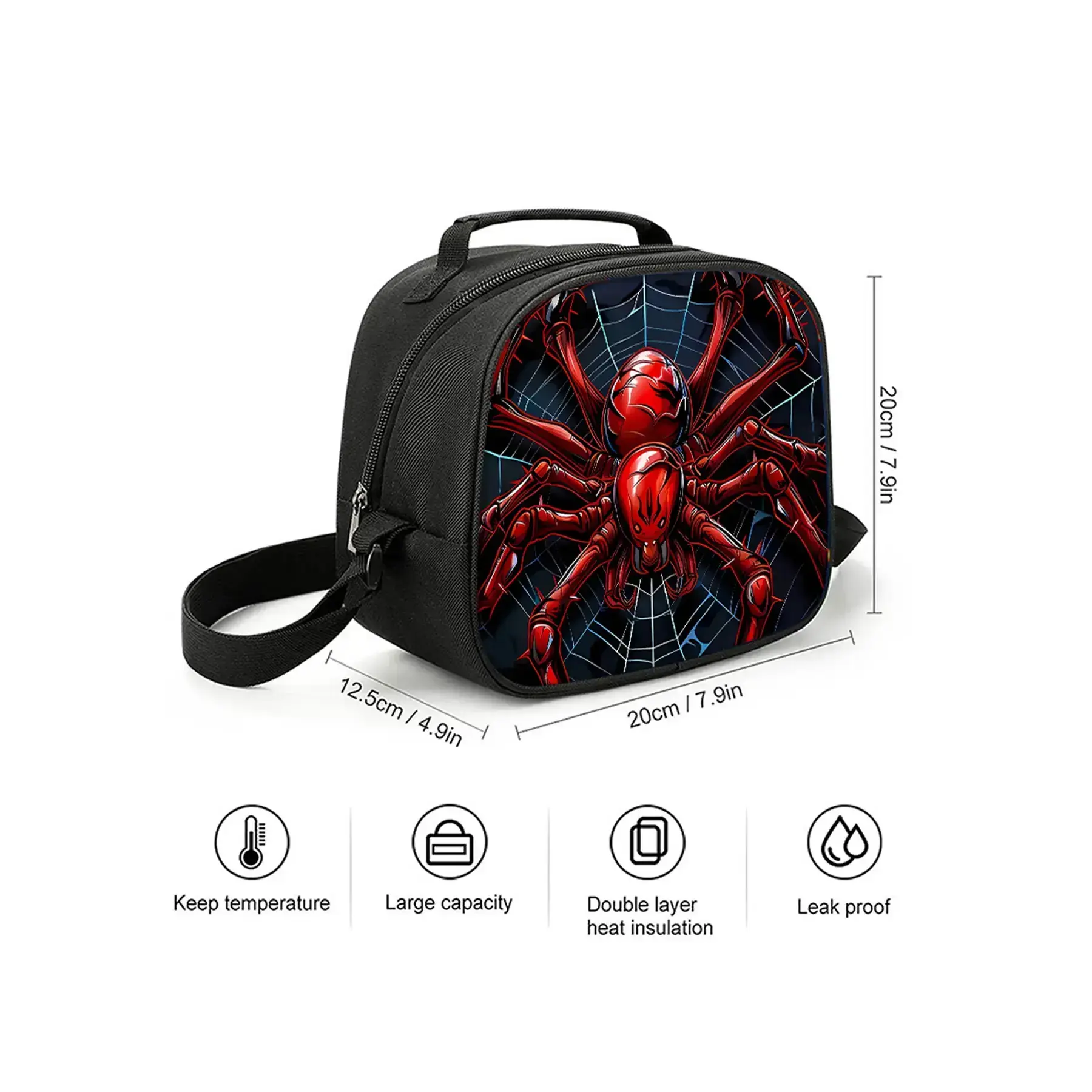 Red spider pattern printed 17-inch backpack for school three-piece set (single-layer backpack + shoulder strap round lunch bag + single-layer pencil bag)