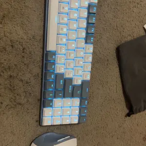 A clean blue-and-white keyboard and mouse setup with a cool, compact design. The surrounding items add personality, though a quick tidy-up would sharpen the look. Nice and functional space!