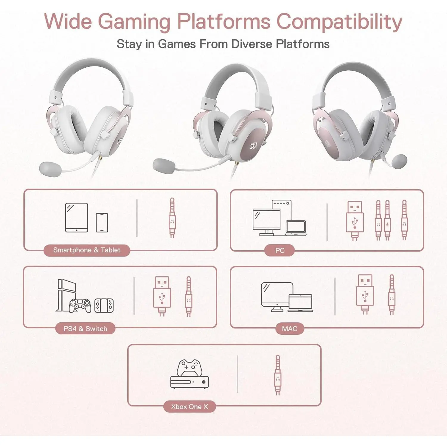 Choose from H510 White, H510 RGB Pink, H350-RGB, H386 Ultra-lite, and H520. All models feature 53mm drivers and 110±3dB sensitivity. The earpads are memory foam cushions with durable fabric covers.