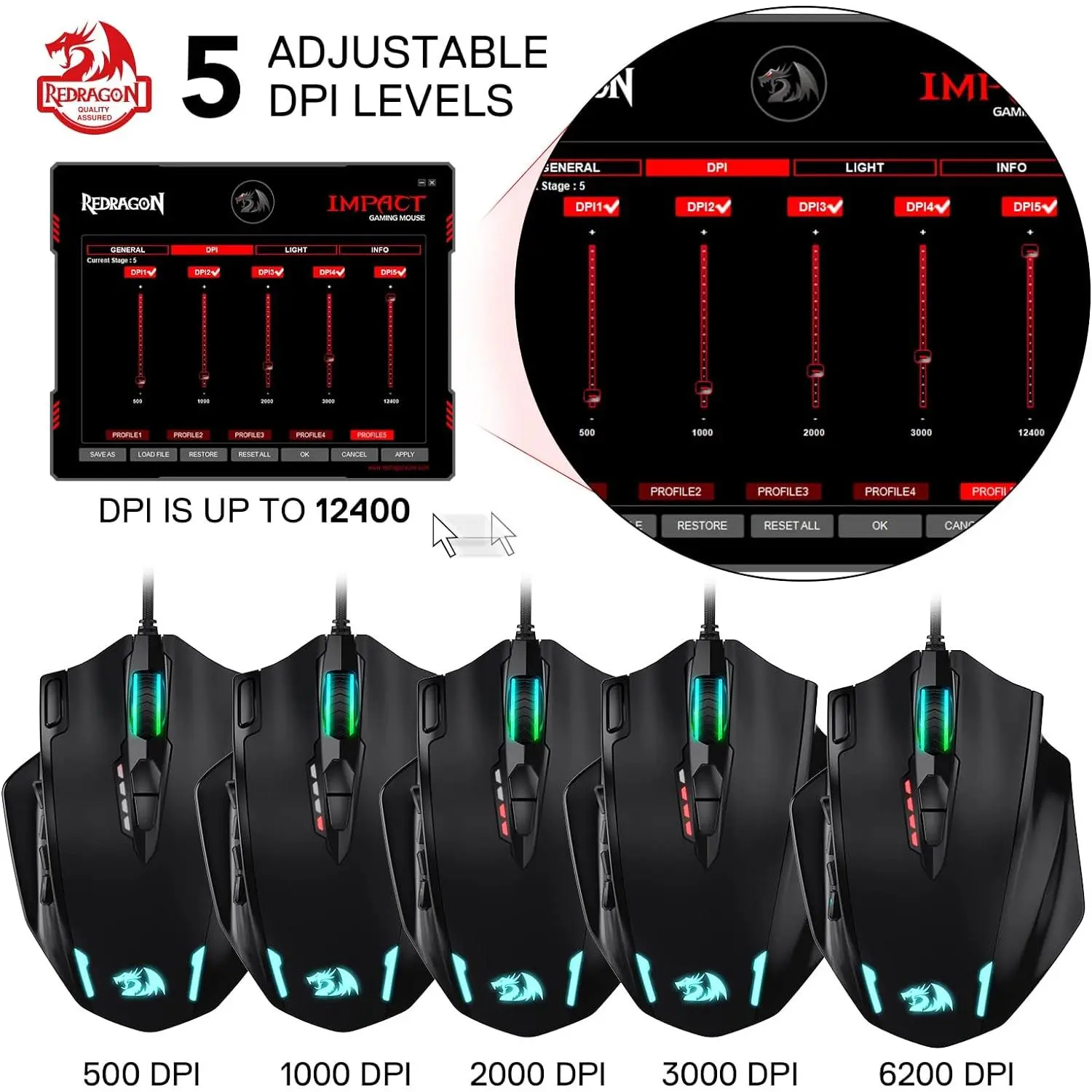 Default 500-1000-2000-3000-6200 DPI will be indicated by the quantity of lights ON. DPI can be adjusted up to 12400 to match mouse speed to gameplay demands and color supports changing via software for personal preferences. 4 polling rates: 125HZ/250HZ/500HZ/1000HZ.