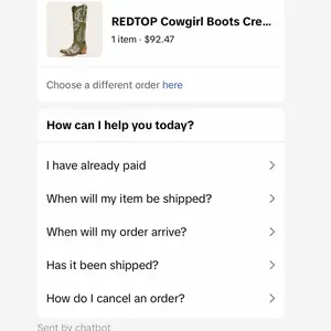 I will never order from this company again. I ordered 2 pairs of boots from them. Messaged about 1 pair that sat for 5 days waiting to be shipped. They are incredibly rude and apparently don’t care about their customers. I’ll take my business elsewhere after this experience