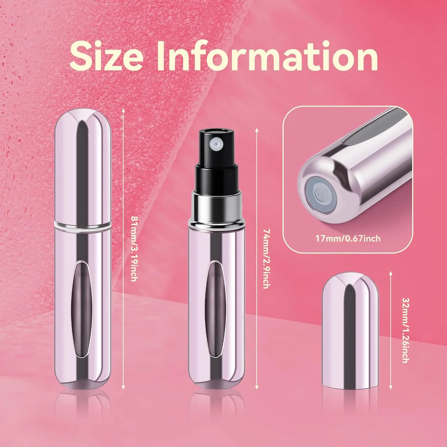 Travel light and fresh with our 4PC 5ML Refillable Perfume Atomizer Travel set, perfect for women and men alike. These portable mini pocket perfume atomizer bottles are a must-have for every jet-setter who loves to keep their favorite fragrances on hand. Product size:3.45*0.67*3.15 in Refillable : Each atomizer bottle can be filled up to 5ml with your favorite perfume or cologne, making it easy to switch up your scent on the go. Turn-lock Closure: The secure turn-lock closure ensures that your fragrances won't spill during travel or in your luggage. Durable Material: Made of lightweight yet sturdy aluminum, these mini misters are built to last through all of your travels. The compact size of these spray bottles makes them easy to slip into any bag or pocket. Perfect for travel accessories or everyday use, you can keep one in each bag so you're always ready for a spritz of fragrance! Care Instructions: Cold wash the atomizers before refilling them with new fragrance. Included in each pack are four refillable perfume atomizers that feature multi-function and multi-compartment capabilities - perfect for the jet-setter who needs everything at their fingertips!