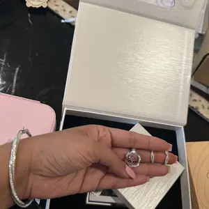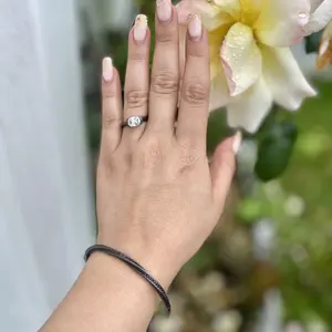 I wasn’t sure what to expect with a nylon band ring, but I had to see it for myself after receiving the necklace. It did not disappoint! The stone is perfectly clear and sparkly and is set securely. The “invisible” band is made to size but I found it slightly big compared to my traditional metal bands. Note this band is bendable, but not stretchable. It is very comfortable and feels like I’m not even wearing anything on my finger.