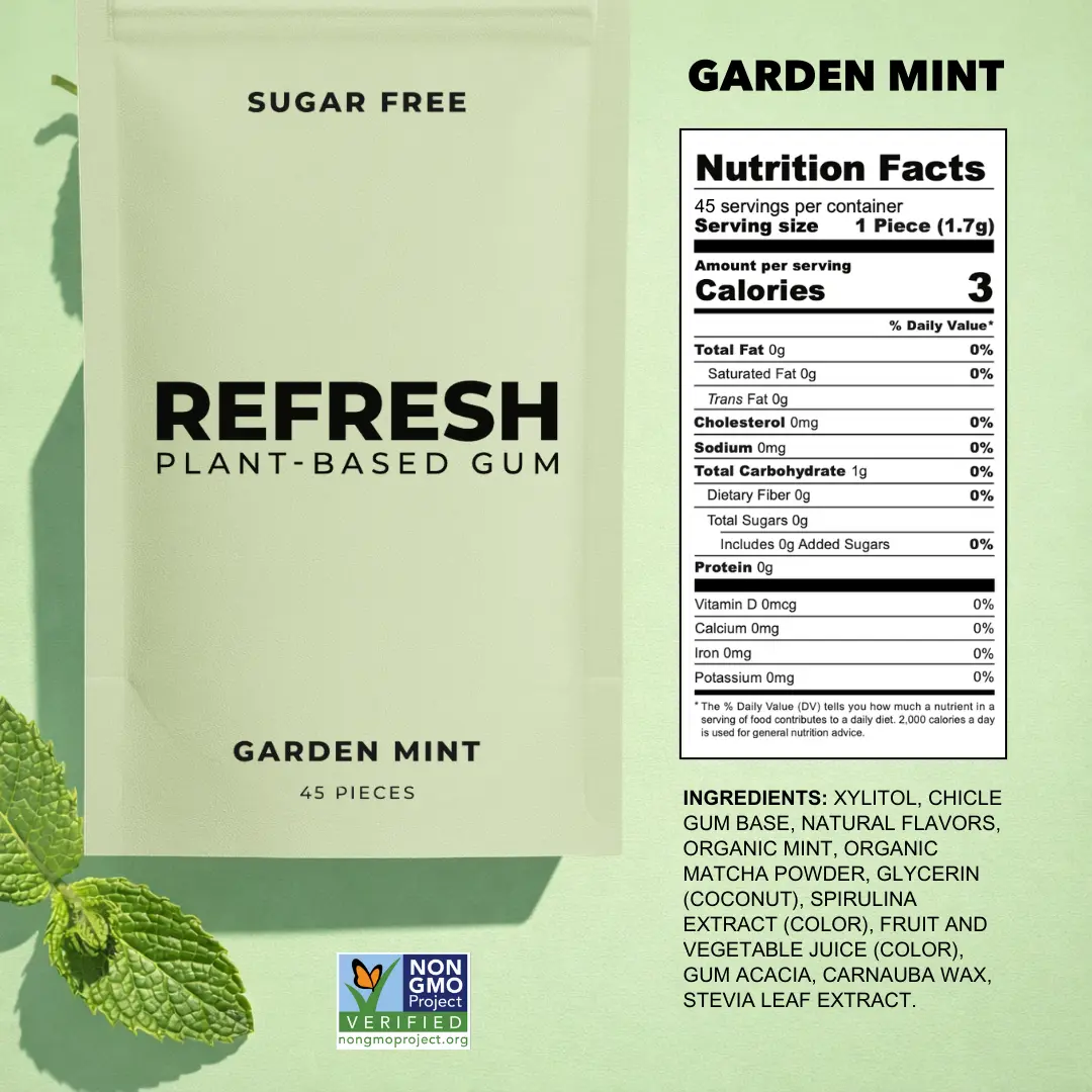 Ingredients: Xylitol, chicle gum base, natural flavors, organic mint, organic matcha powder, glycerin (coconut), spirulina extract (color), fruit and vegetable juice (color), gum acacia, carnauba wax, stevia leaf extract.