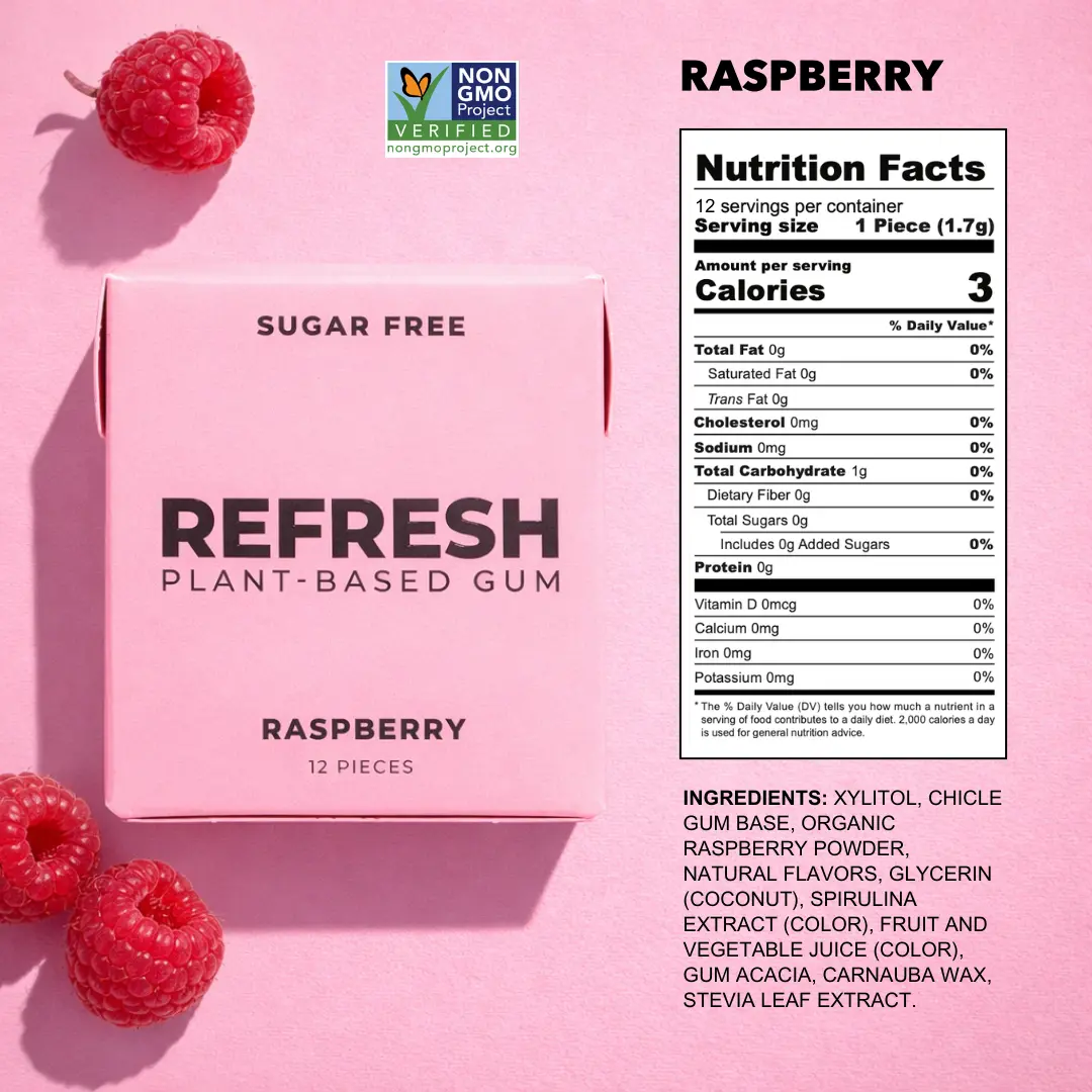 ·Raspberry: Xylitol, chicle gum base, natural flavors, organic raspberries, glycerin, fruit and vegetable juice, gum acacia, carnauba wax, stevia leaf extract.