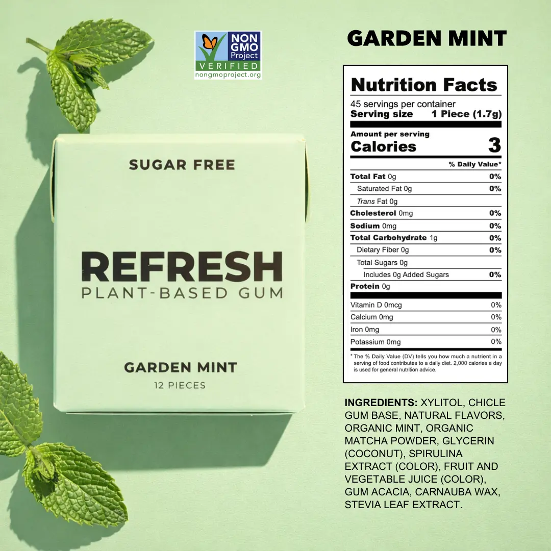 ·Garden Mint: Xylitol, chicle gum base, natural flavors, organic mint, matcha powder, glycerin, spirulina extract, fruit and vegetable juice, gum acacia, carnauba wax, stevia leaf extract.