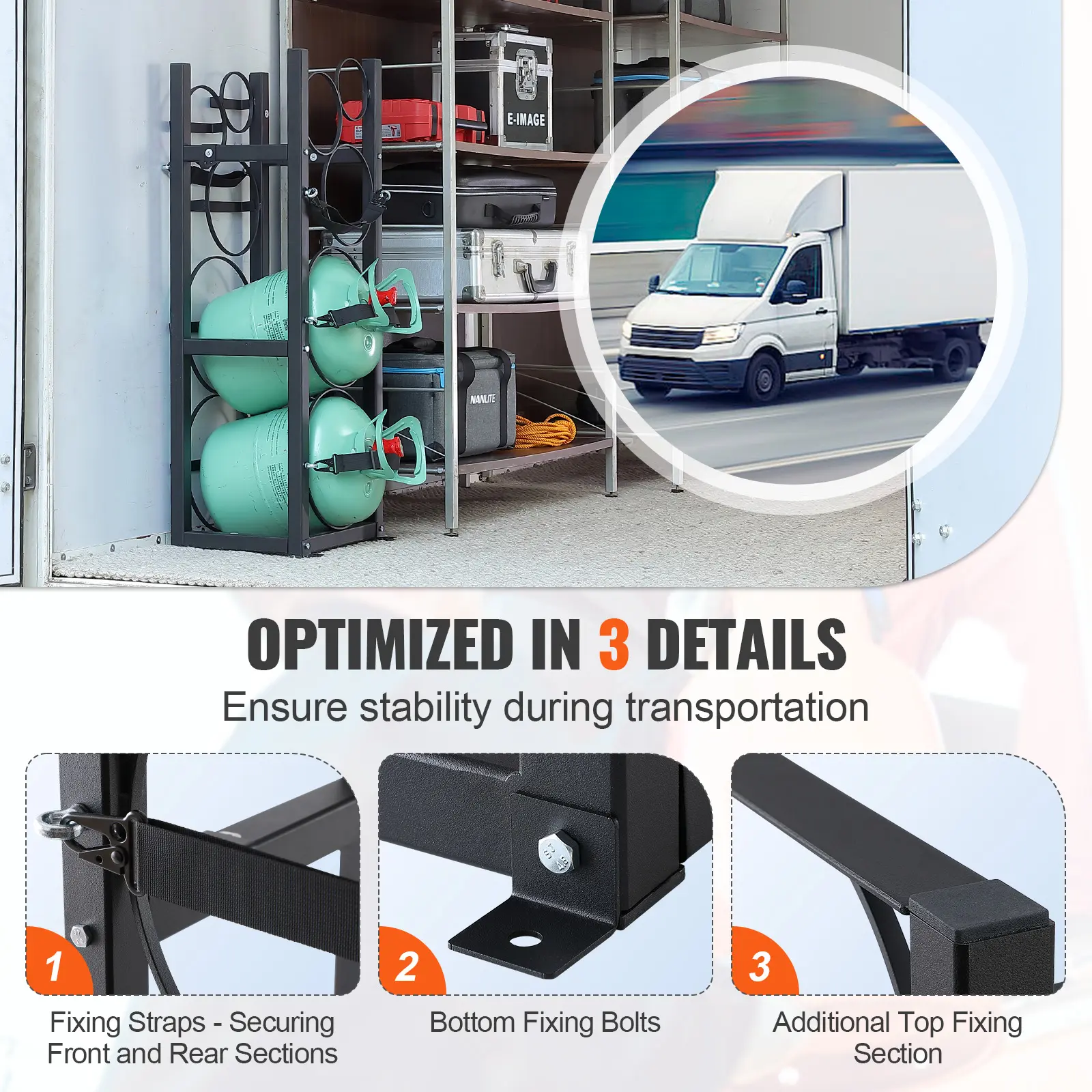 • Secure Transport: Tilted storage shelves prevent tank sliding, reducing the risk of accidents. Carbon steel fixing bars on both sides are designed for vehicles, with pre-drilled holes for various carriages. And the tanks securely attach to the vehicle without shifting using included screws, ensuring safe transport.