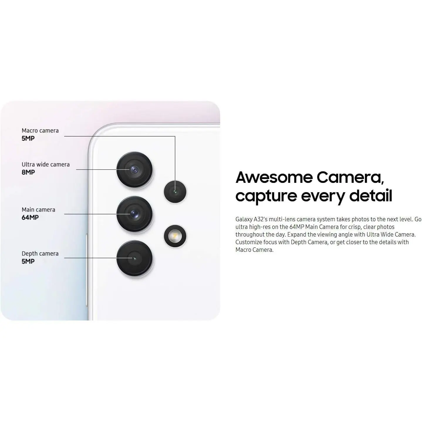 The 6.5-inch HD+ Infinity-V display provides bold, crisp color from edge to edge. This spacious display is designed for your viewing pleasure. Capture stunning selfies and epic landscapes with the Galaxy A32 5G's awesome camera.