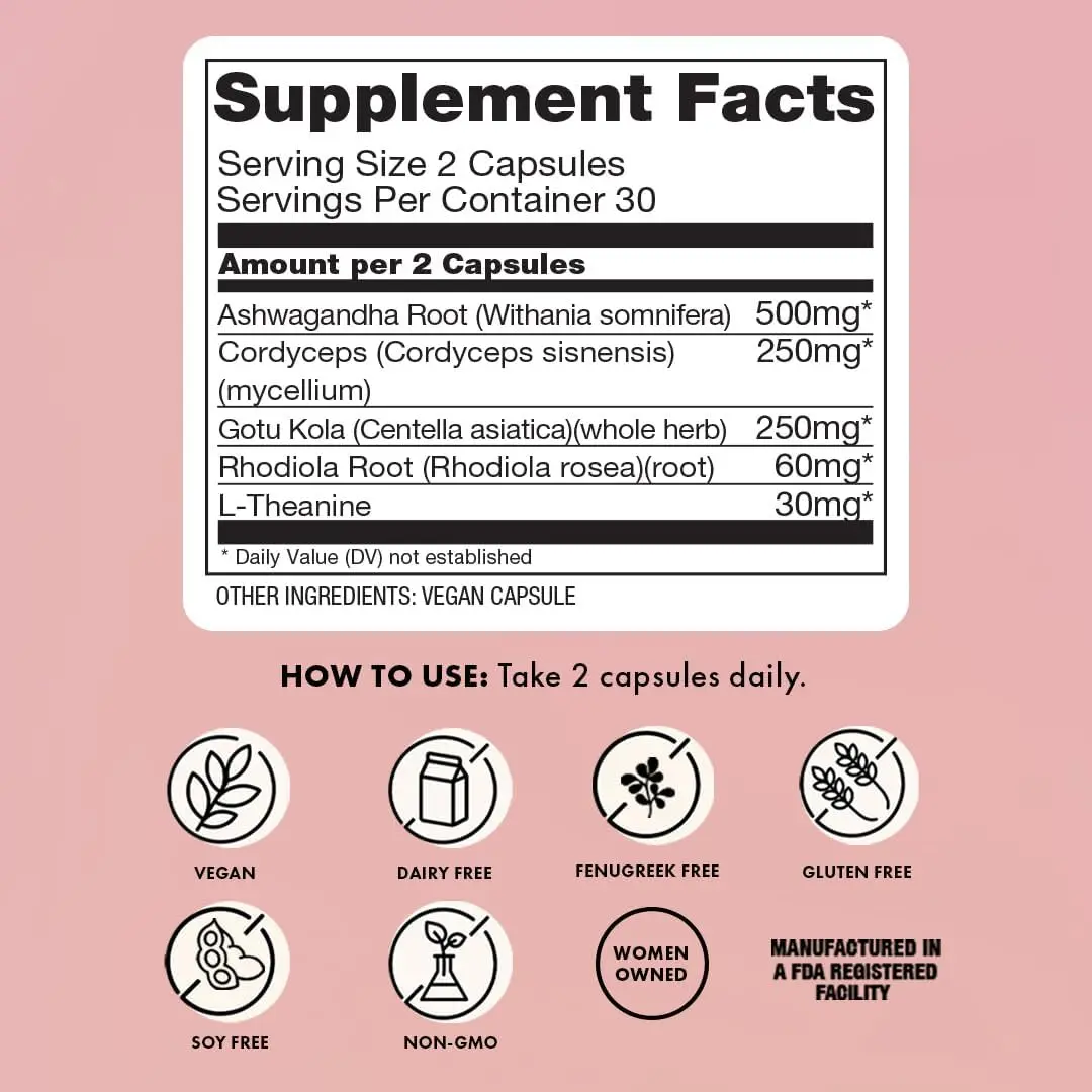 Revitalizing Ingredients Moms Trust- Supports stress management with a calming blend of Ashwagandha root, Gotu Kola, Cordyceps, Rhodiola, & L-Theanine. Our caffeine-free, non-GMO, vegan, and gluten-free product empowers you to thrive in any stage of motherhood with serenity and vibrant energy.