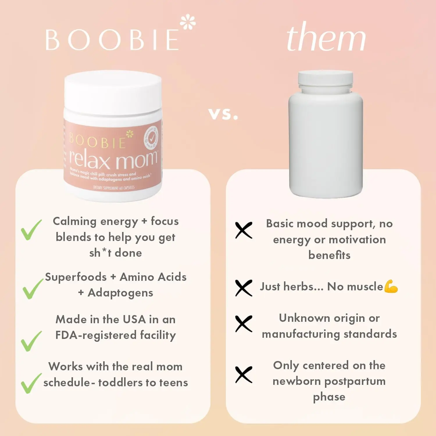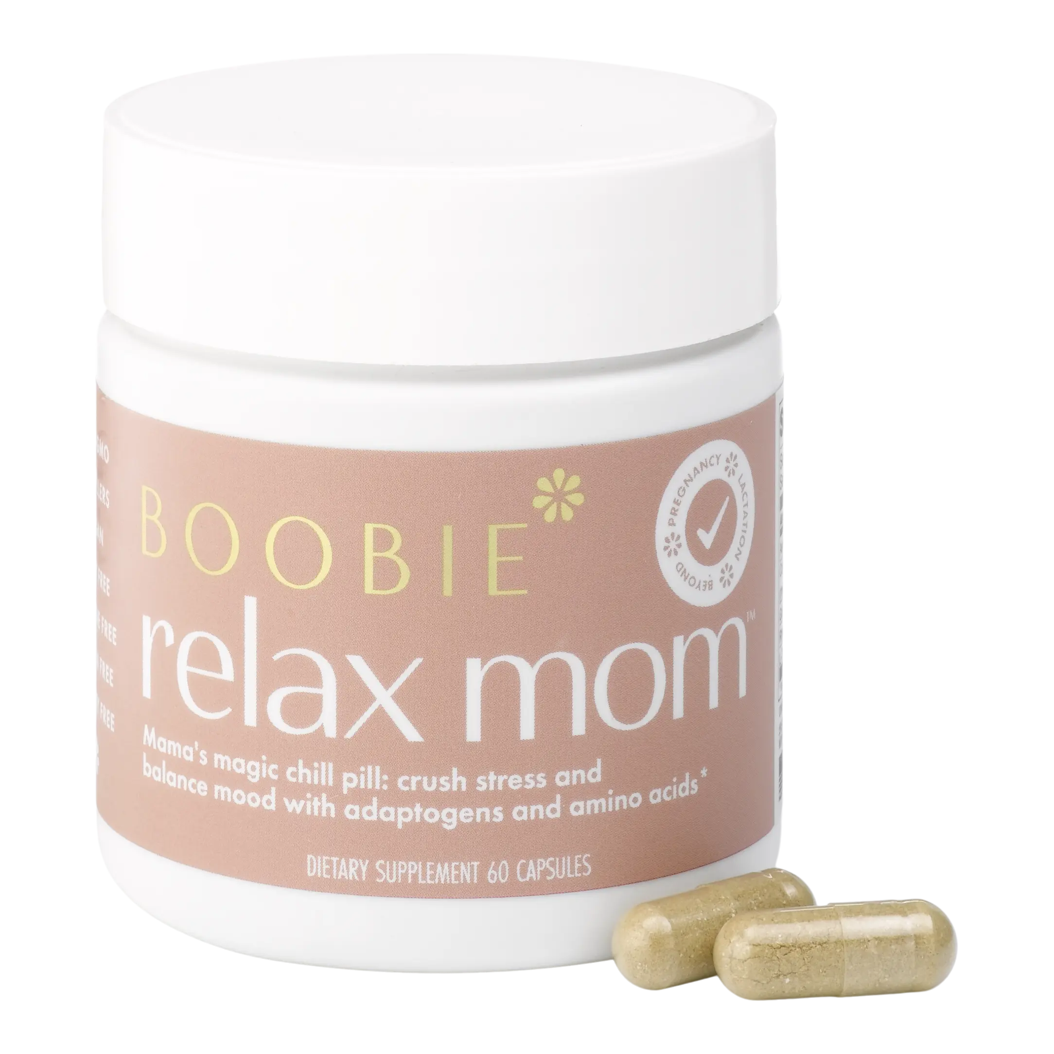 Mama's Magic Chill Pill - Helping say goodbye to racing thoughts and hello to calmer days with Boobie Relax Mom. Our stress and mood support supplement blends natural adaptogens and proven ingredients, so you can enjoy each day with more peace and presence. Take 2 capsules daily for continued support.