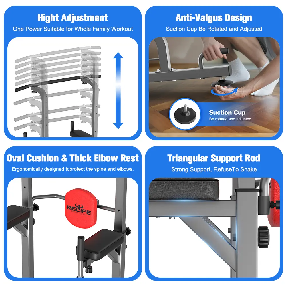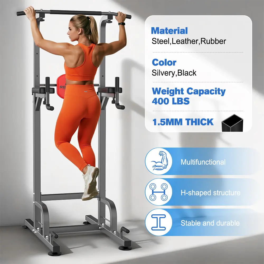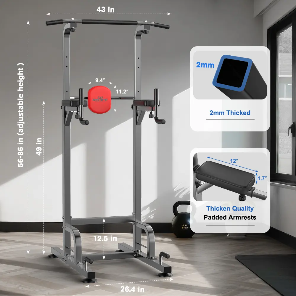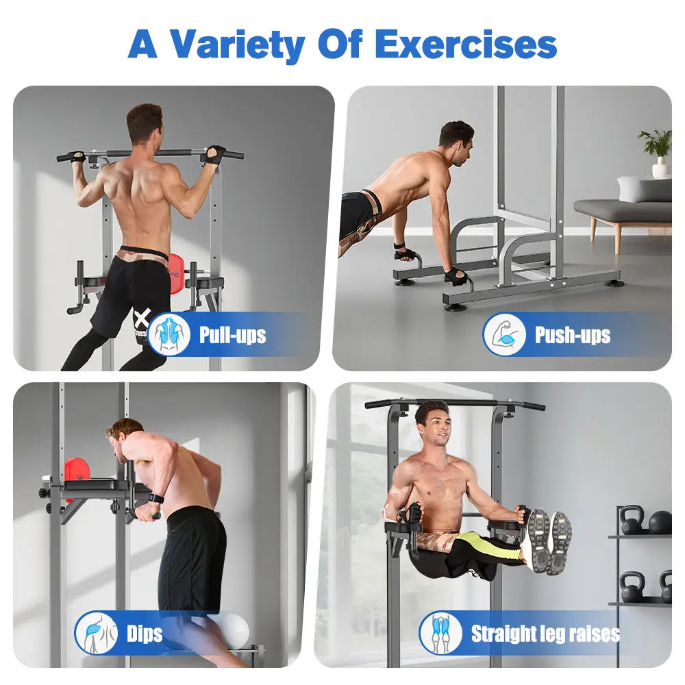 This power tower supports vertical knee raises, push-ups, dips, and pull-ups. It targets arms, core, shoulders, chest, and back, helping to build a stronger upper body.