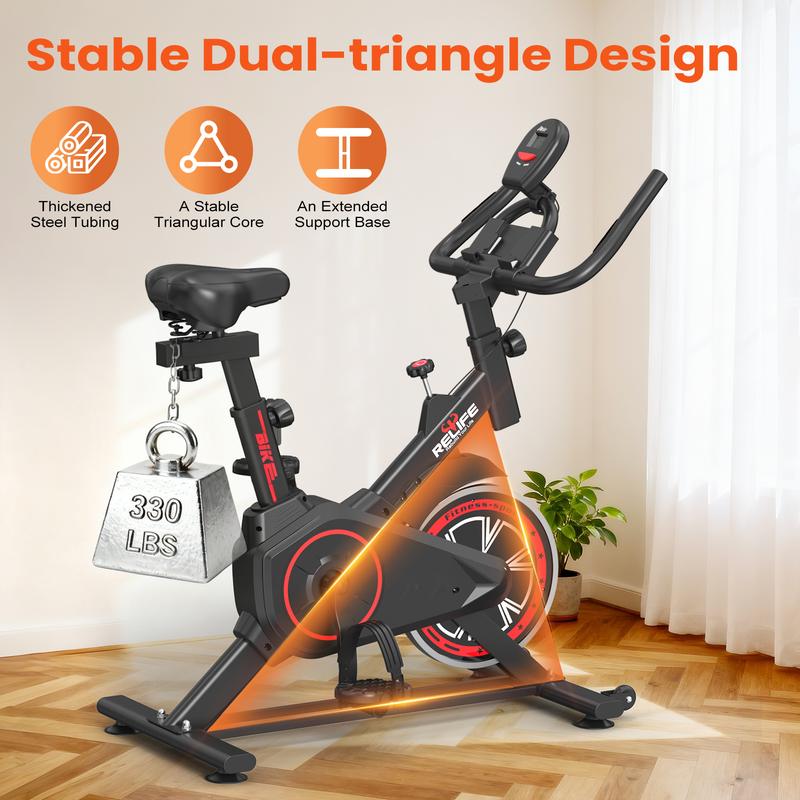 ·【Sturdy Indoor Stationary Bike】Our exercise bike uses a scientific triangle-shaped frame with a solid base to bring higher stability and make your riding more secure . The stationary bike can weigh up to 330 lbs.