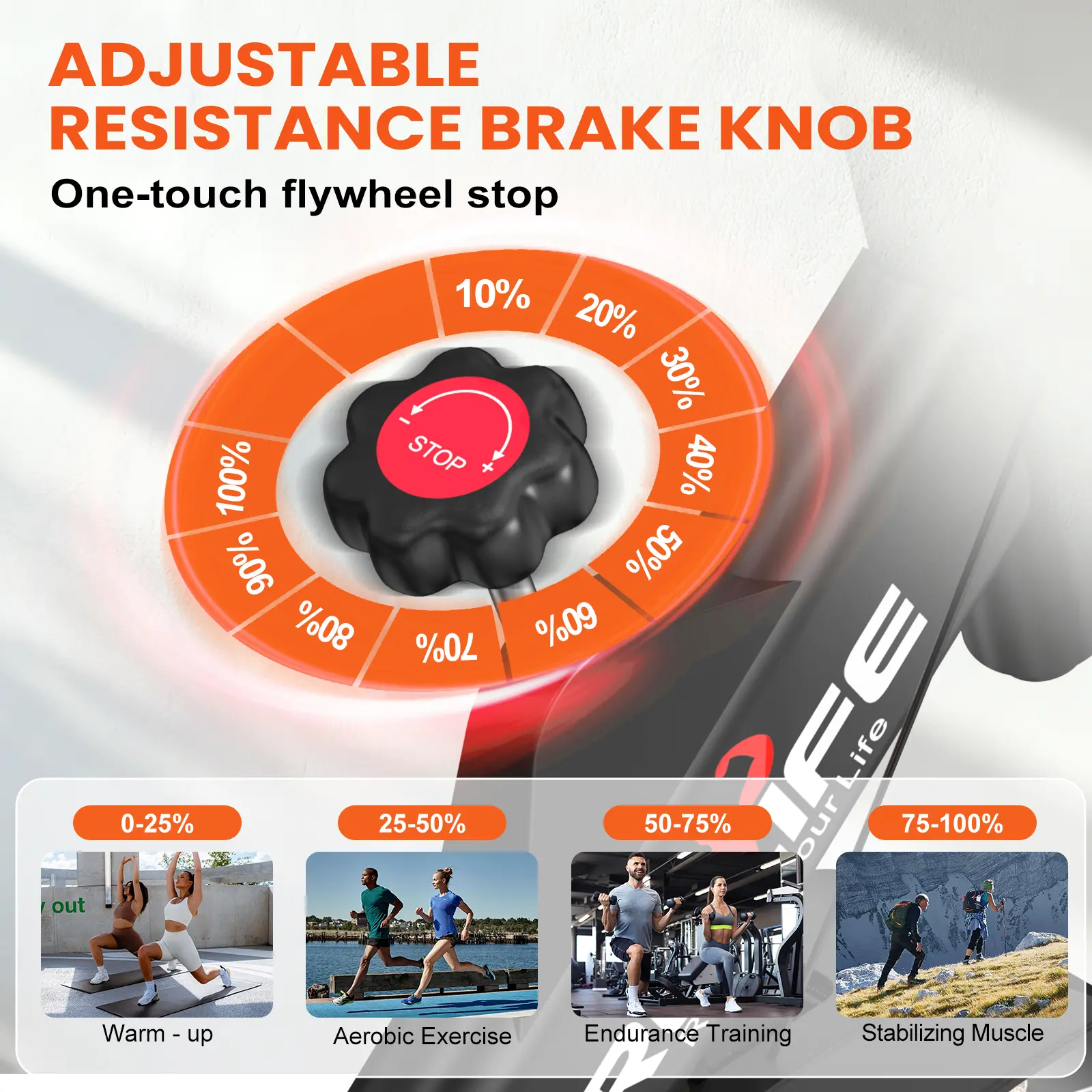 ·【Brake And Resistance】Our indoor bike combines resistance adjustment with a brake button. You can adjust the resistance by twisting the knob to meet the fitness intensity required for different workout programs. Press down on the knob to brake.