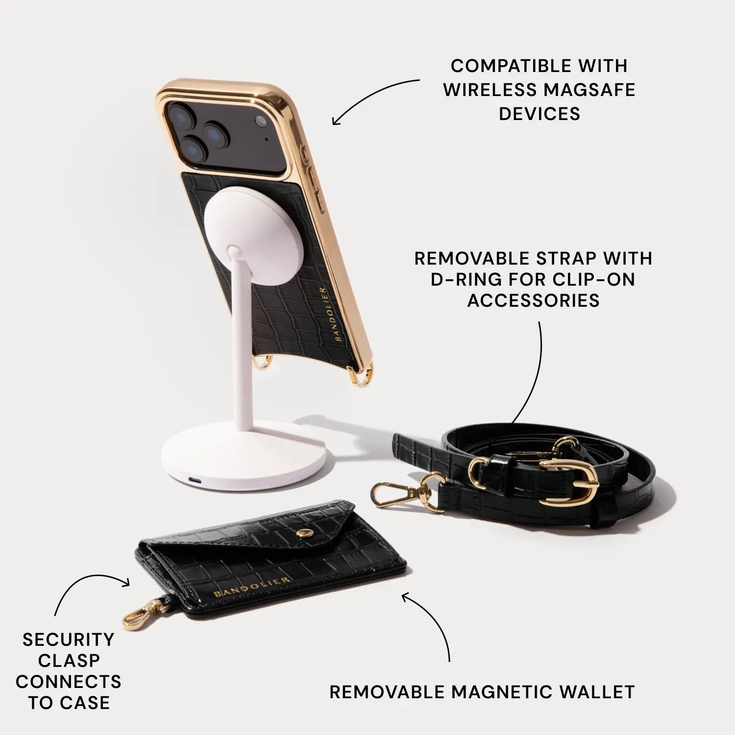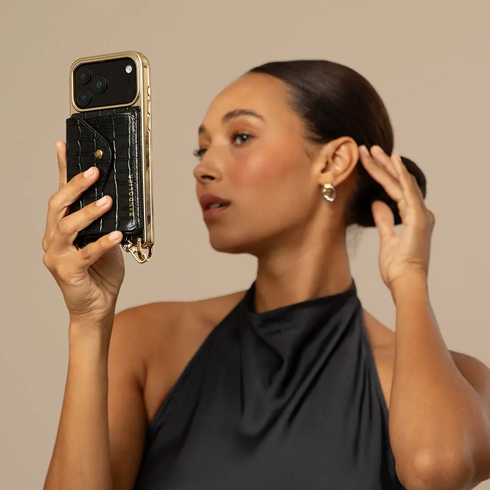 Remi Magnet Wallet Crossbody Phone Case - Black Croc/Gold
