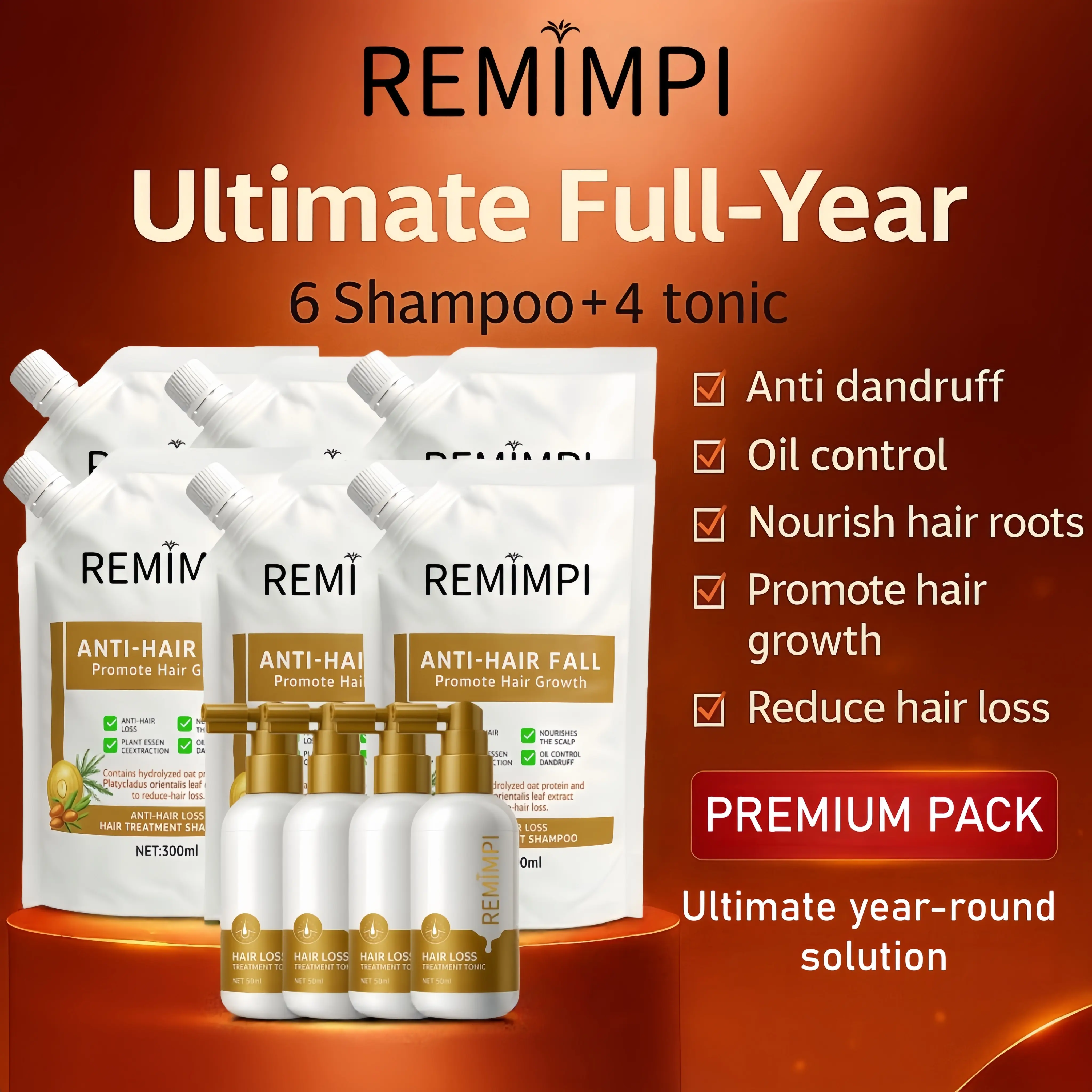 The REMIMPI Ultimate Care System is your all-in-one annual hair restoration plan — a full-year supply of shampoo and tonic designed for consistent, visible, and long-term results.