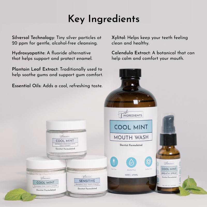 Experience the refreshing cool mint flavor of our new Remineralizing Mouthwash, brought to you by Just Ingredients and formulated in collaboration with dentist Dr. Michelle Jorgensen. This powerful mouthwash is designed to strengthen your teeth and improve overall oral health.