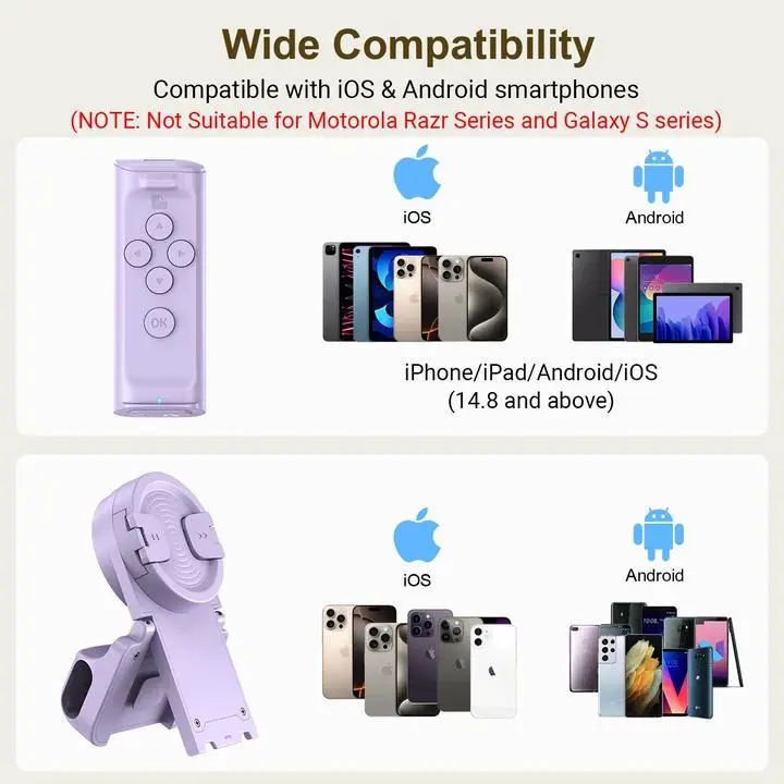 This remote allows you to trigger image or video recording from up to 65 feet away, enabling you to take family photos, selfies or videos by yourself, no matter where you are.(NOTE: Upgraded version works with default camera & Tiktok's camera function)
