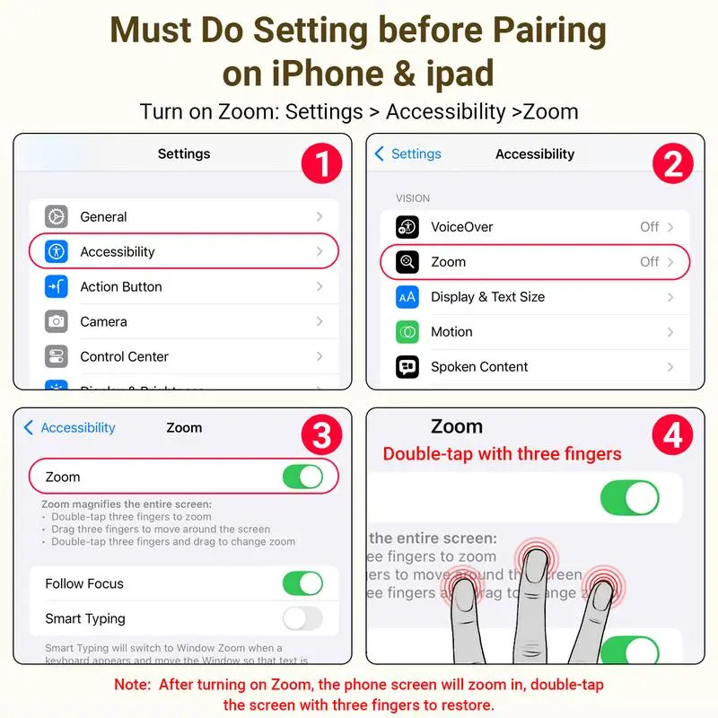 MUST DO before Pairing on iPhone/iPad - Open the 'Zoom'feature.