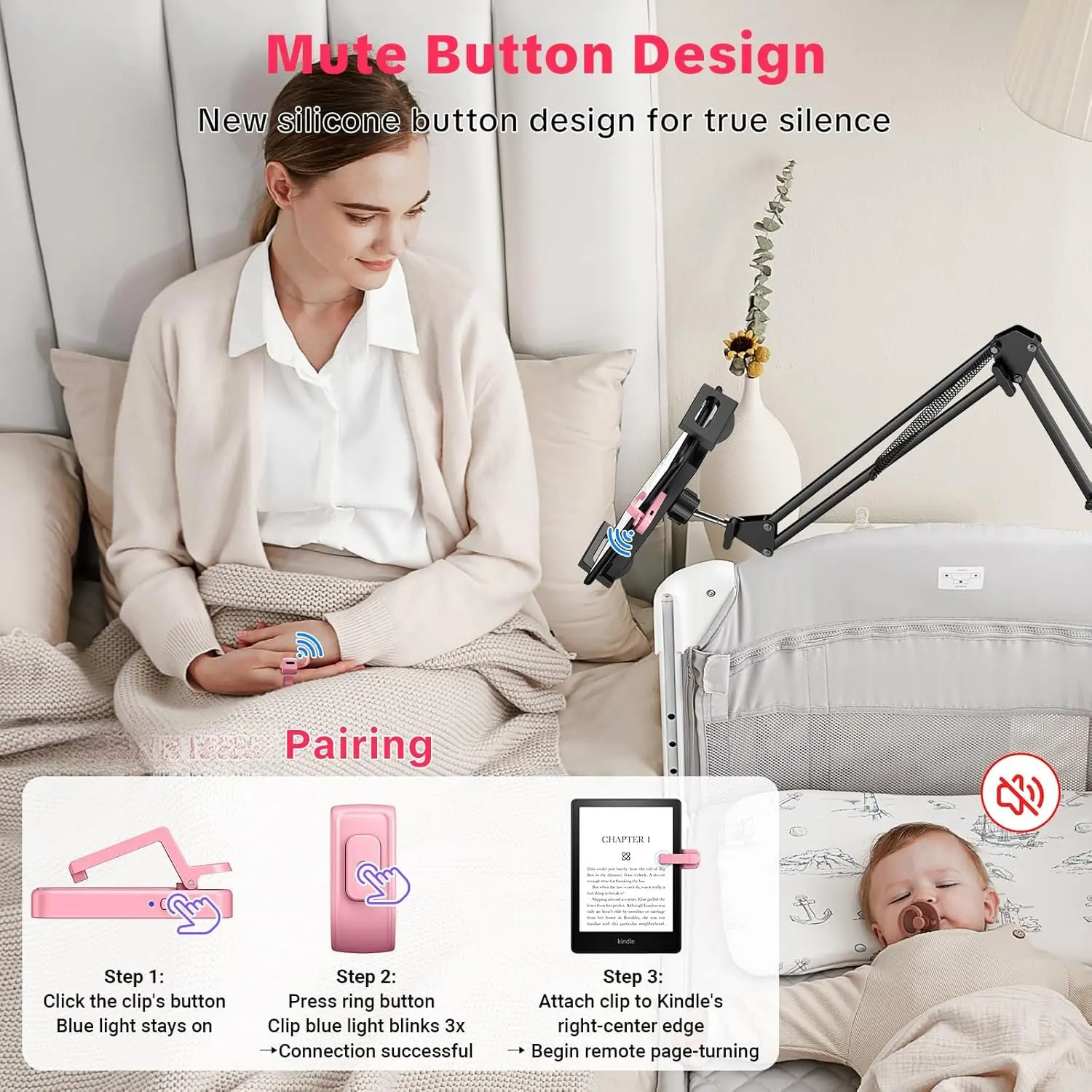 【Silent Buttons & No Needed】Page turner remote for kindle equipped with soft buttons for noiseless page turning—ideal for nighttime reading without disturbing others. Uses RF technology, requiring no or . Easy one-step connection, for ages