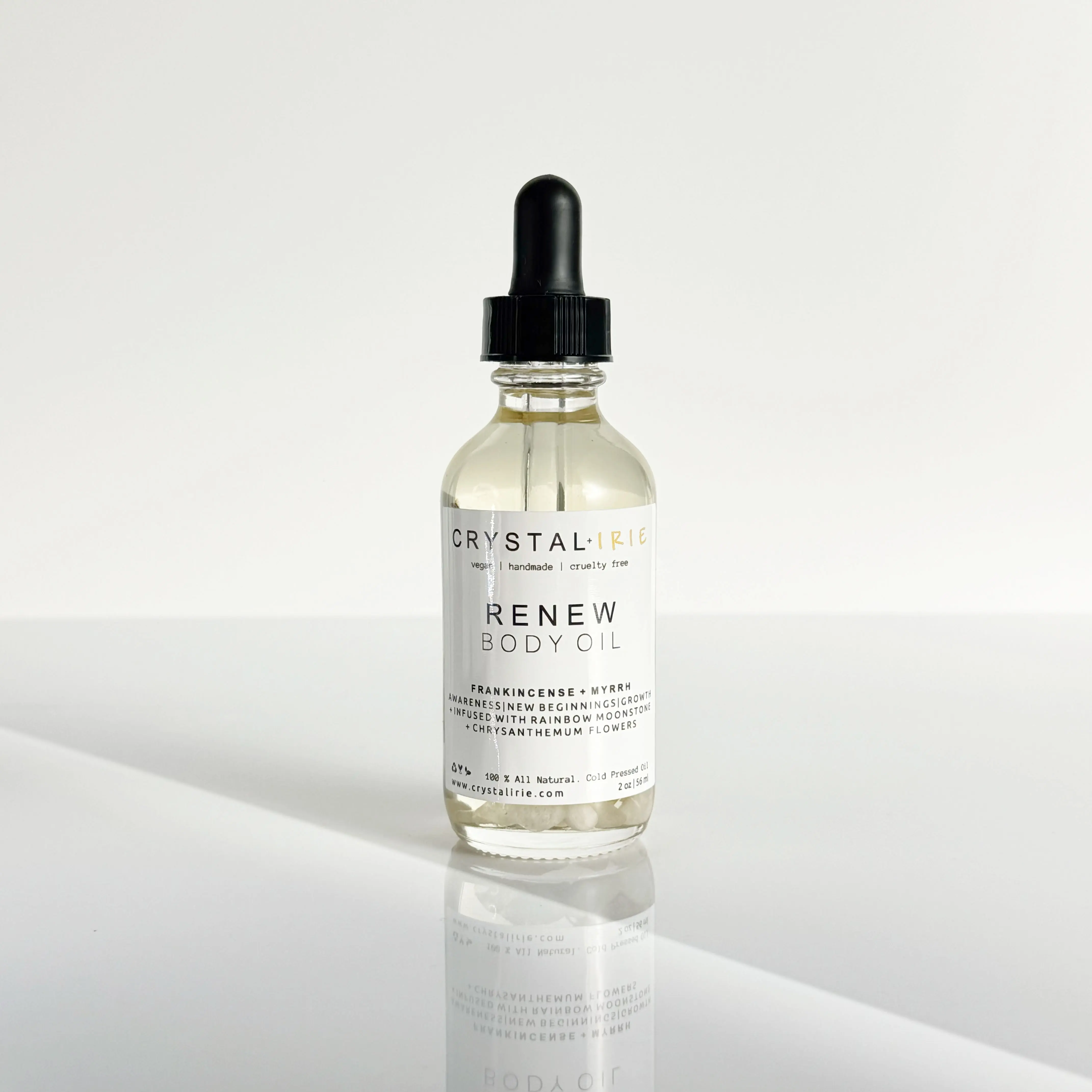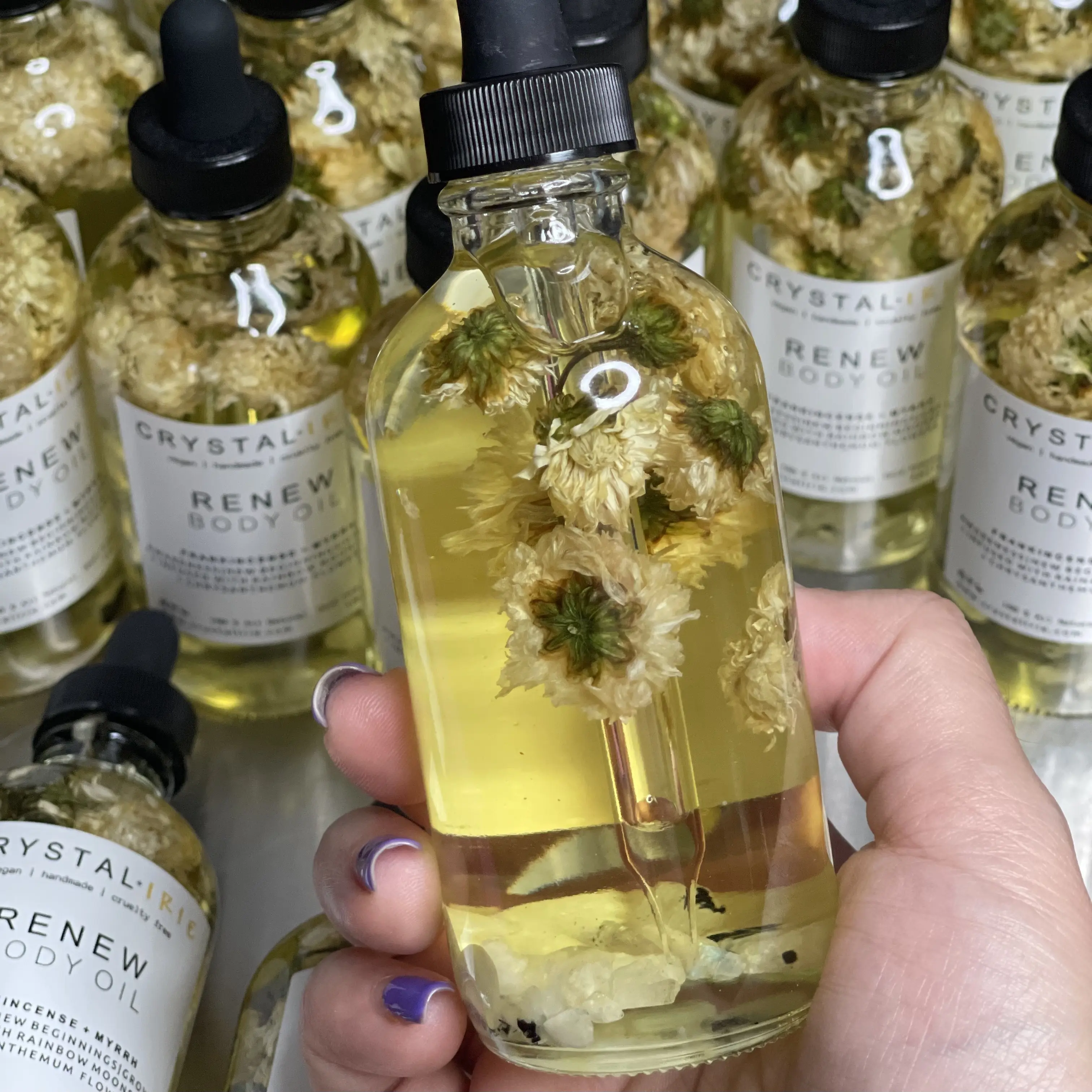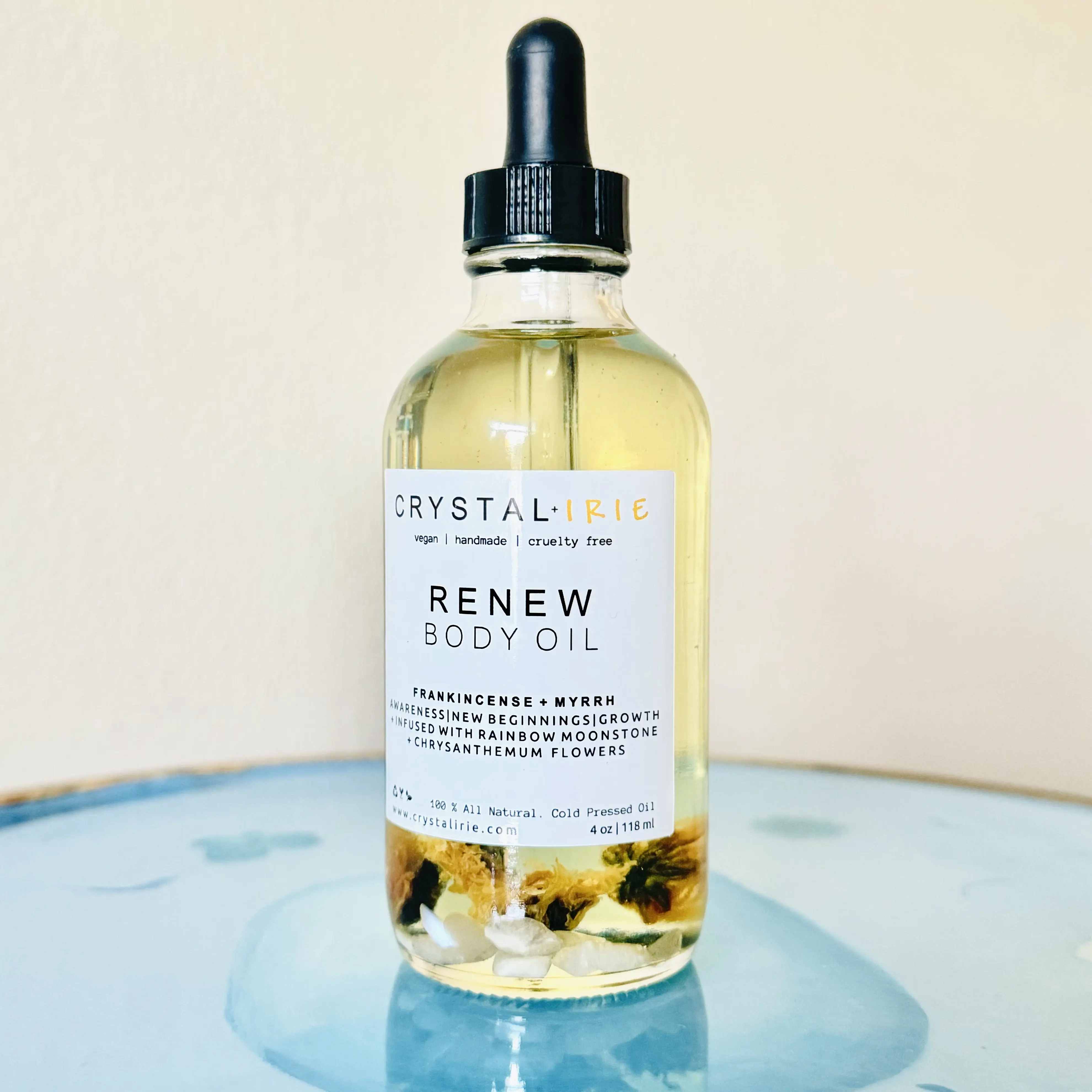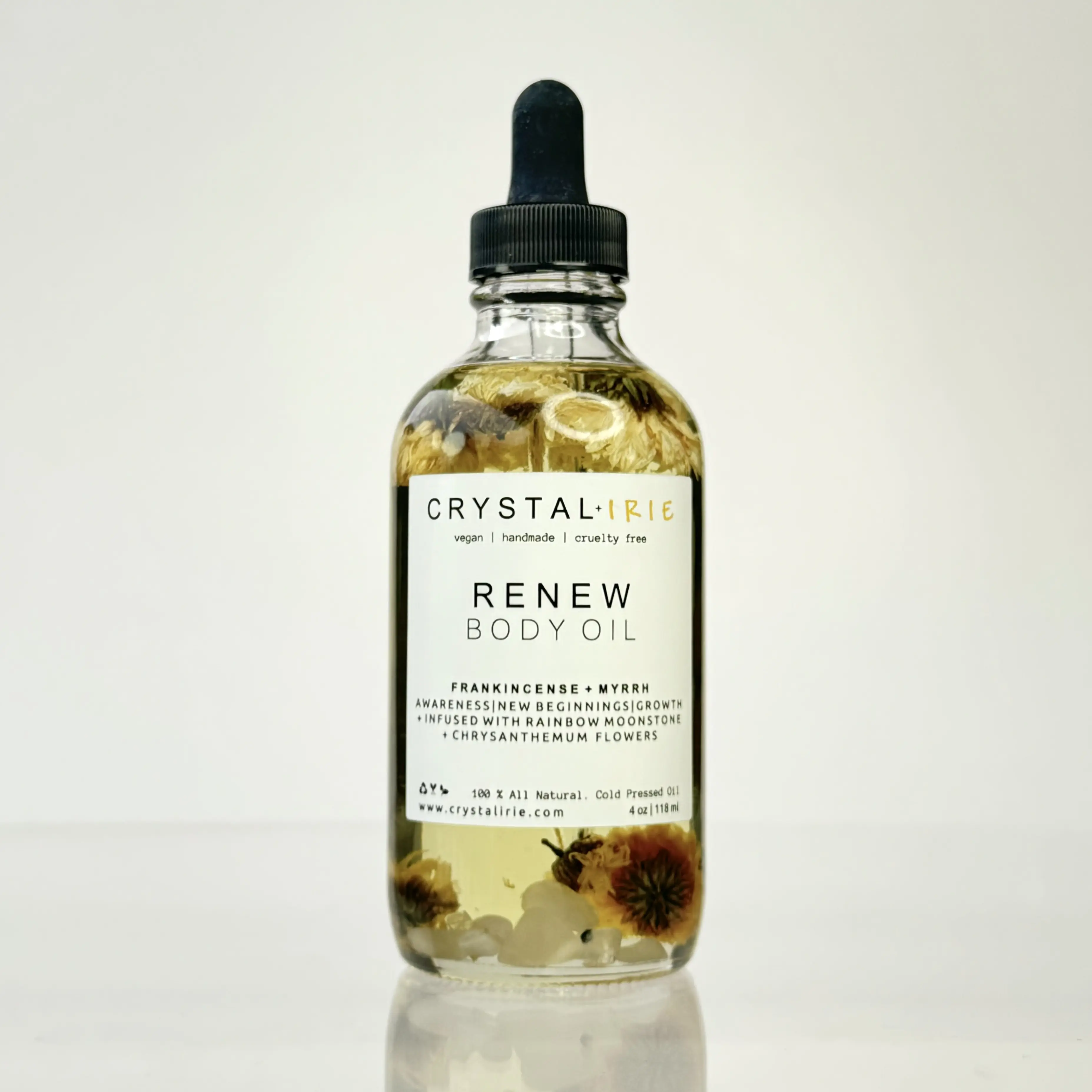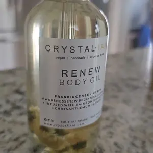 Renew Body Oil is a lightweight full body oil is Infused with Chrysanthemum Flowers and Rainbow Moonstone. Made with Sunflower oil, sweet almond oil, and vitamin E oil. Scented with a traditional rich blend of Frankincense and Myrrh. This is a dry oil that absorbs into your skin quickly, leaving your skin smooth, hydrated, and silky. Can help with dry, itchy, irritated skin.