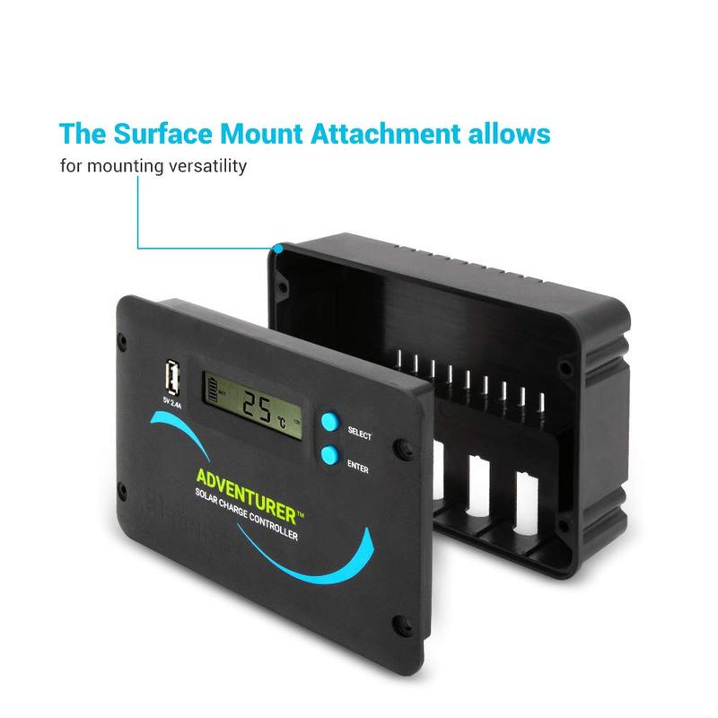 Meet the Renogy Adventurer-Li, newly improved with two advanced features. Thanks to its programmable Lithium charging voltage, the 30A PWM solar charge controller is now capable of charging most Lithium batteries available on the market. The second addition to the controller is the RS232 port, used to connect and communicate with the Renogy BT-1 Bluetooth module. By adding the BT-1 to the Adventurer-Li, you can now use the smartphone app, Renogy DC Home, to monitor and adjust your solar system remotely. Unique in its form, the Adventurer-Li is a negative-ground, flush mount controller, designed for an aesthetically clean and integrated look on RV and camper walls. However, if flush mounting does not appeal to you, an included Surface Mount Attachment allows you to forgo it. Capable of charging both 12V and 24V photovoltaic systems, the Adventurer-Li integrates highly efficient PWM charging to increase battery longevity by regulating the charge flowing from the solar panels to the battery bank. This charge controller comes equipped with a fully comprehensive self-diagnostic system and electronic protection functions to prevent damage from installation mistakes or system faults.