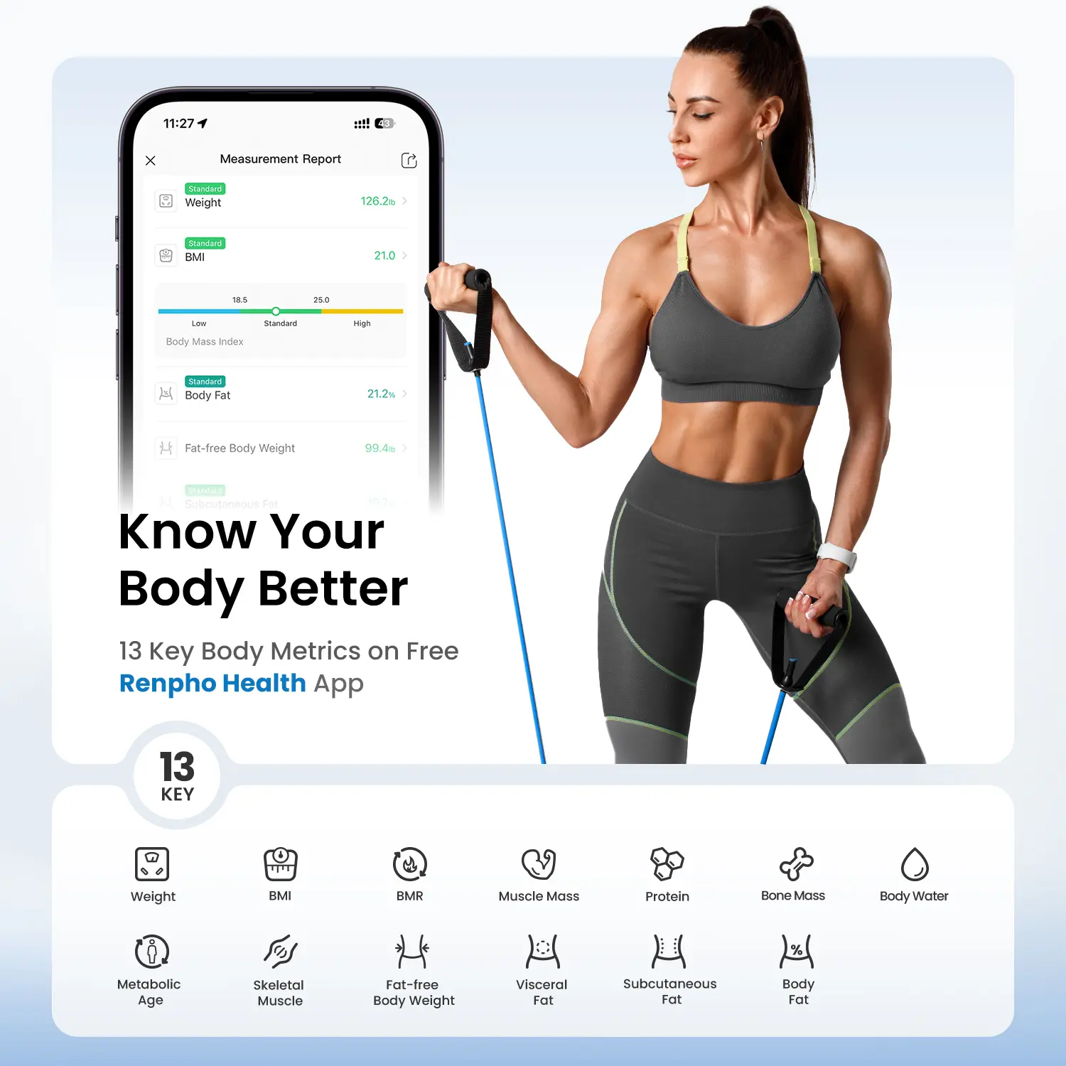 ·7-in-1 Larger LED Display: The LED display on this smart scale shows 7 key metrics, including weight, BMI, body fat, muscle mass, and more. Connect to the Renpho Health App to monitor 13 metrics.
