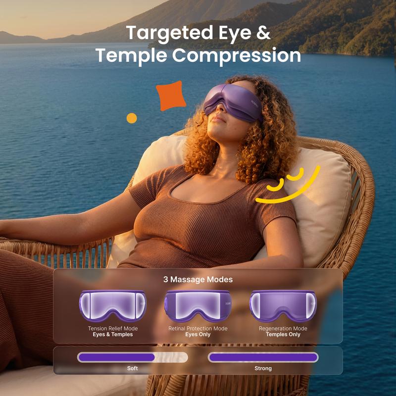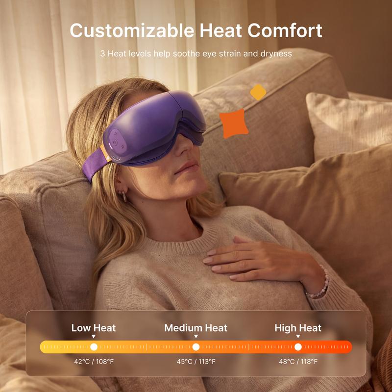 Multiple air pressure modes gently massage the eye area and temples, while evenly distributed heat (107°F, 113°F, 118°F / 42.2°C, 45°C, 48°C) helps relieve eye strain, migraines, tension and reduce dryness for calm, refreshed eyes — ideal for meditation, relaxation, or bedtime routines.