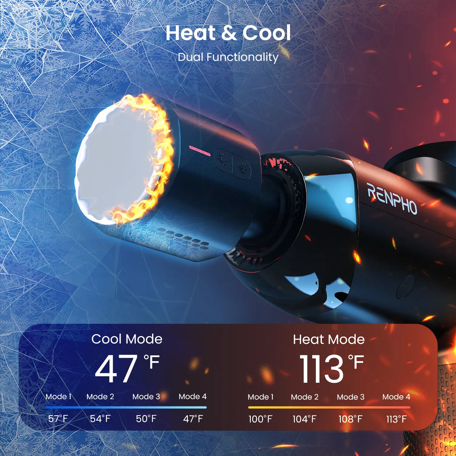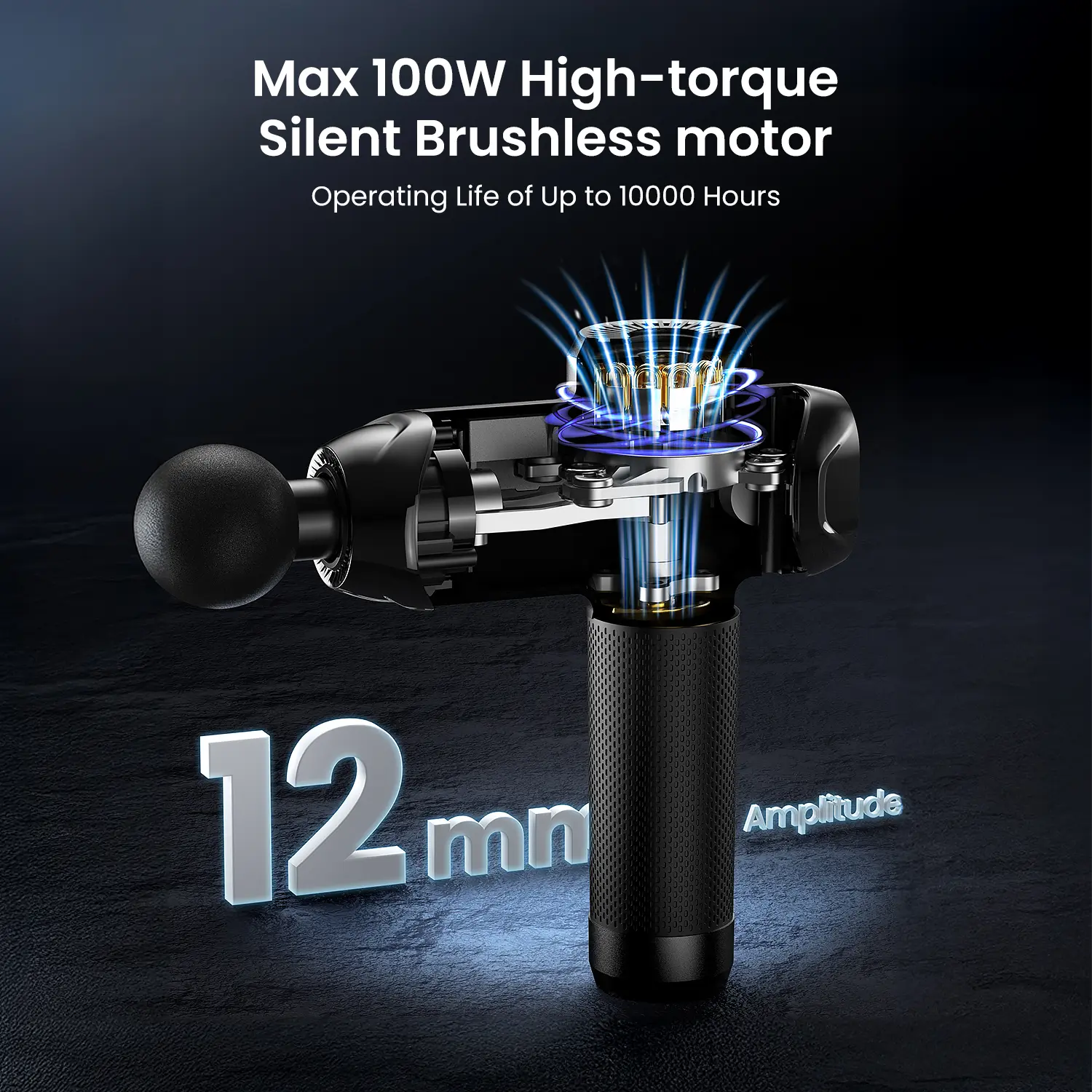 High-torque motor delivers 50 lbs force, 12mm amplitude, and 2600 RPM for deep pain relief.