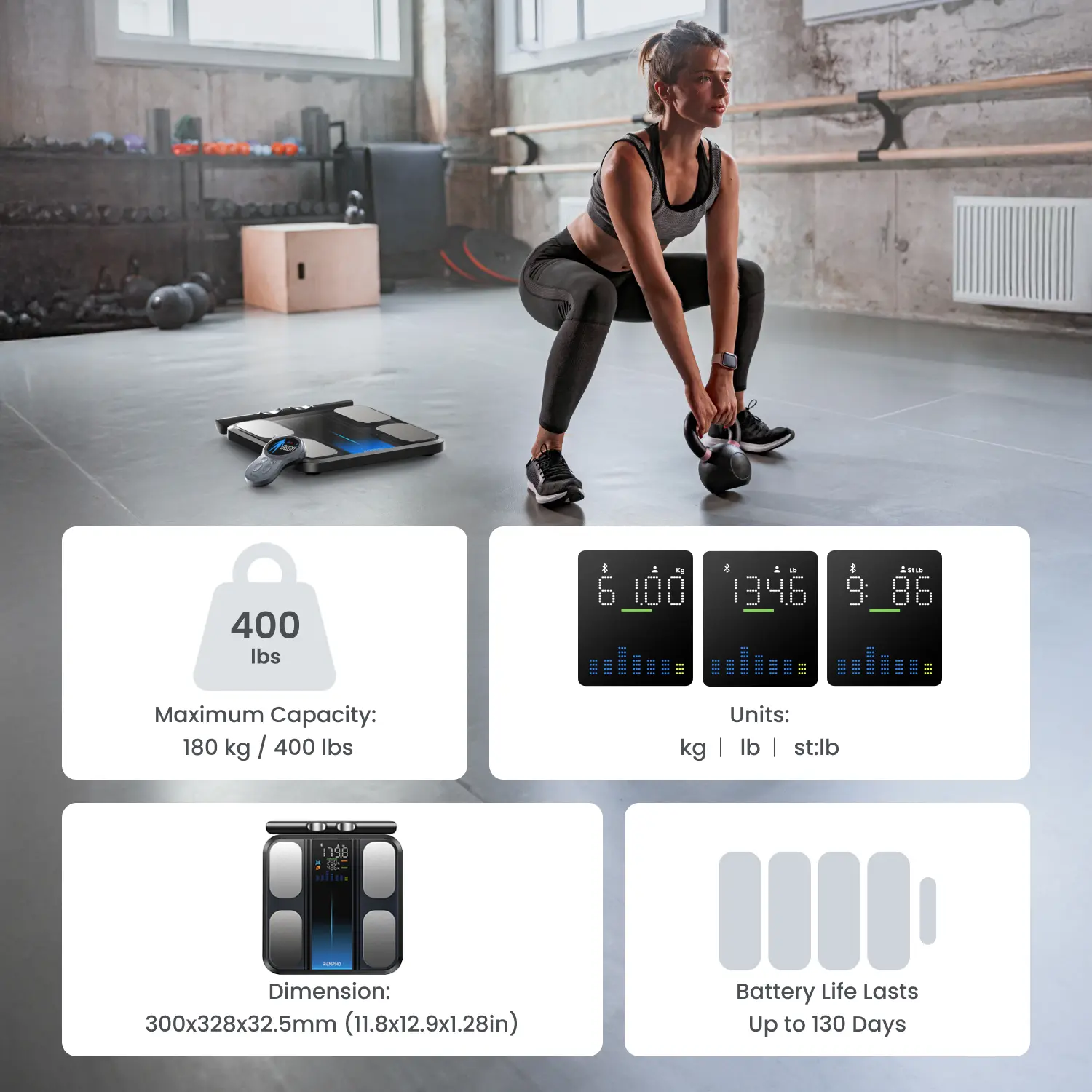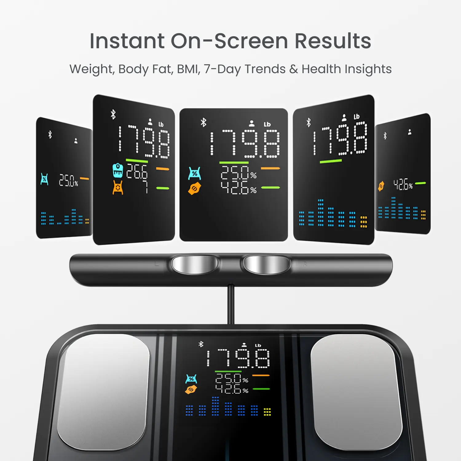 ·Full-Body Insights – Tracks BMI, fat %, muscle %, visceral fat, and 7-day trends for up to 8 users.