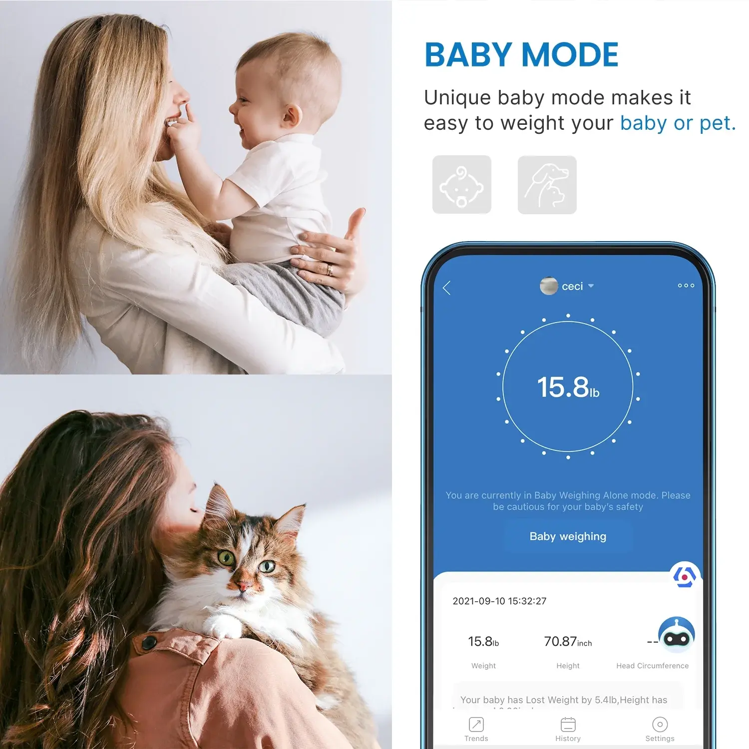 Special mode lets you weigh babies or pets and track their growth easily.