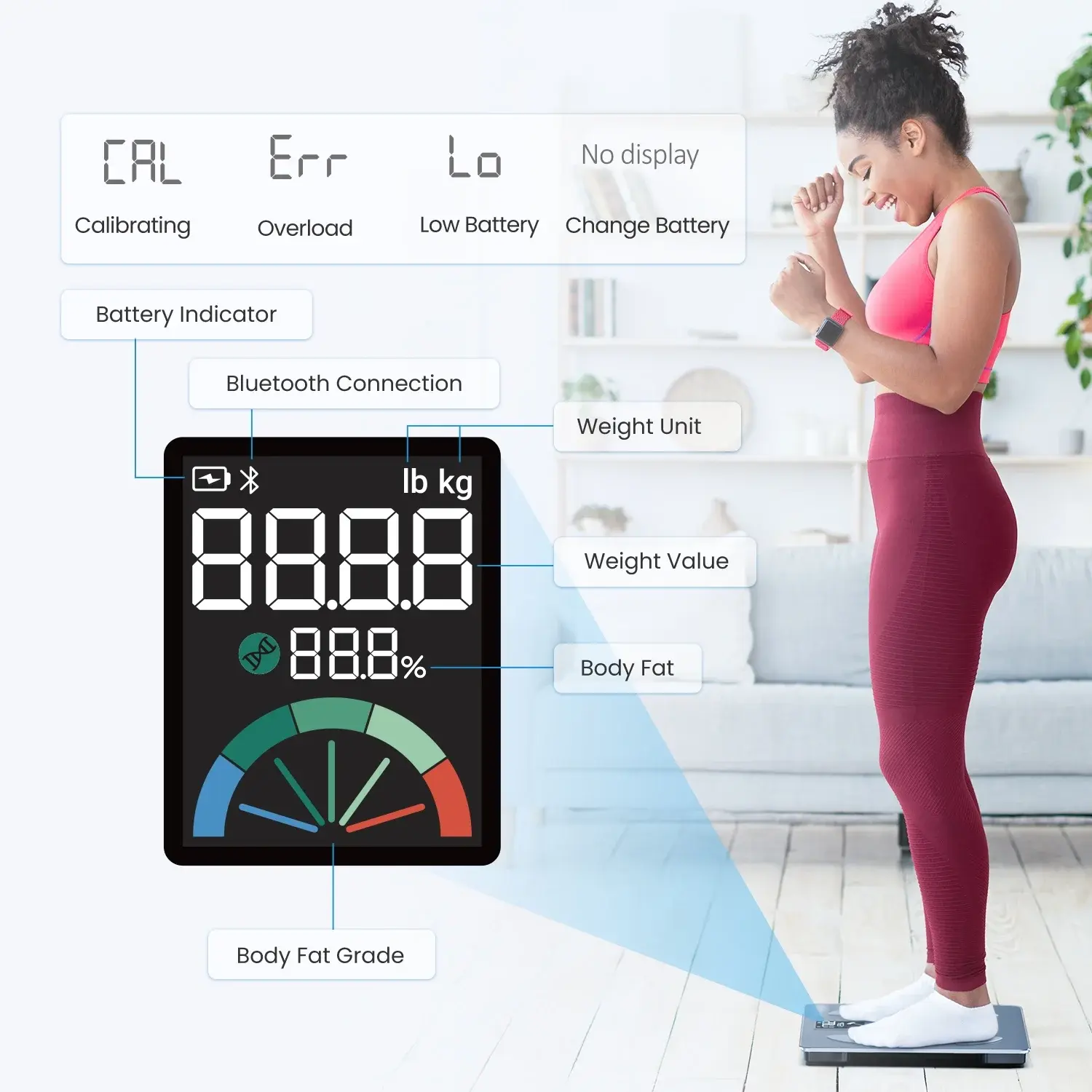 See your key data clearly on a large color VA screen — weight, body fat, and body fat grade shown directly on the scale.