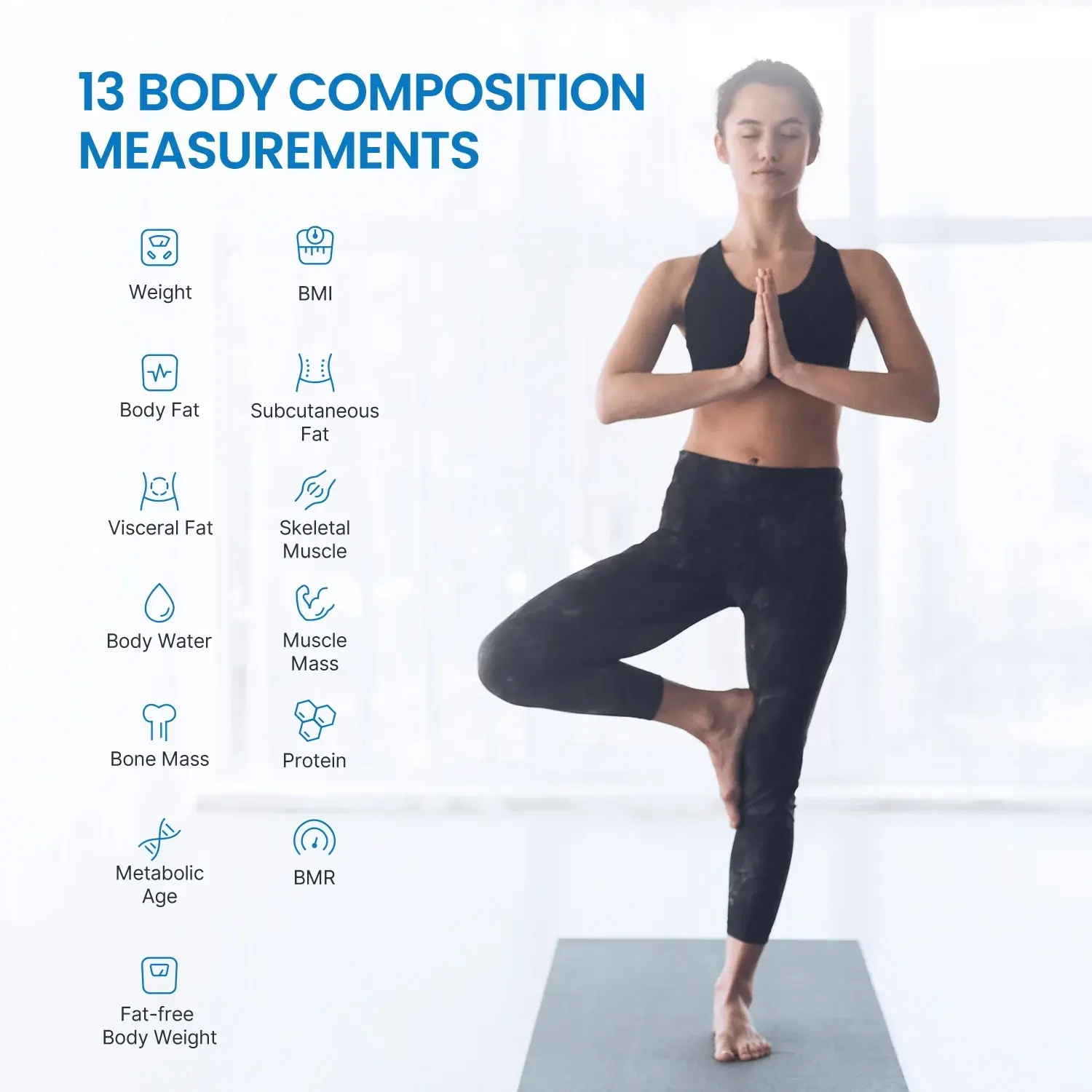 Weight, BMI, body fat, water, muscle, protein, bone mass, BMR, visceral fat, metabolic age and more — all in one step.