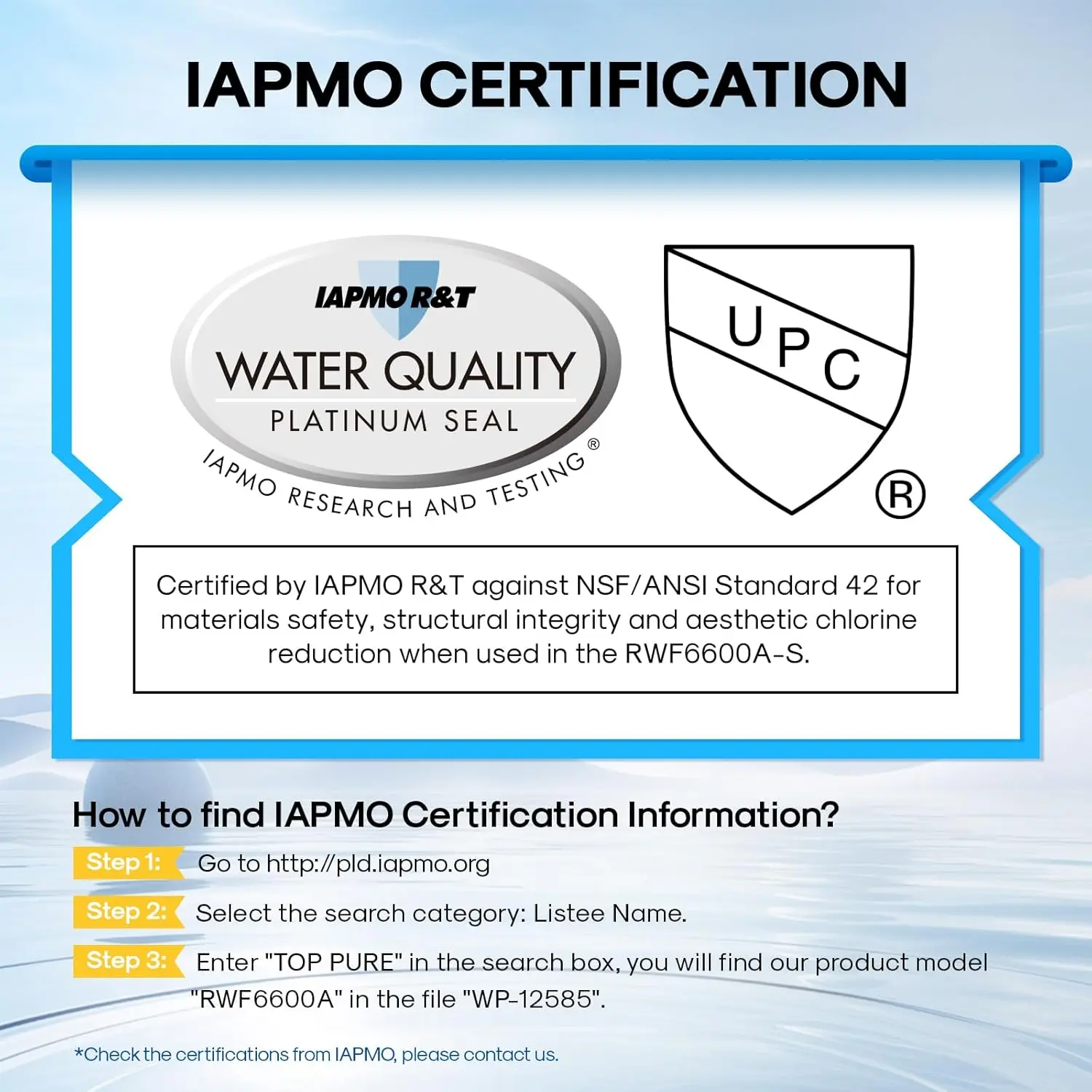 Excel.Certifications- RFC6600A replacement for 4396841 water filter tested and certified by IAPMO against NSF/ANSI 42 to reduce 99% Chlorine and color, enhance the taste, providing a fresher and more enjoyable drinking experience.