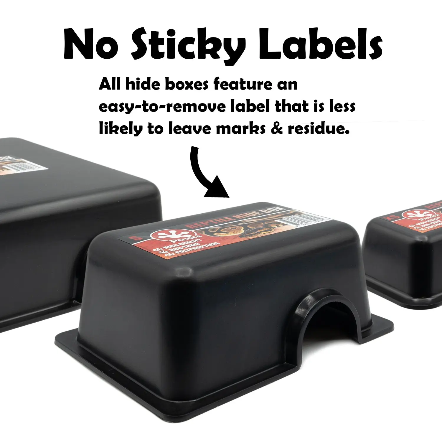These reptile hide boxes are made of heavy 1/8" thick plastic and can withstand just about anything. The plastic is smooth inside and outside of the hide box making cleaning a snap. These units are designed for ease of use and sanitation and make great hides for shoebox or tub type rack systems and terrariums. Door placement is offset to really give your pet a sense of security which aids in reducing stress in captive reptiles.