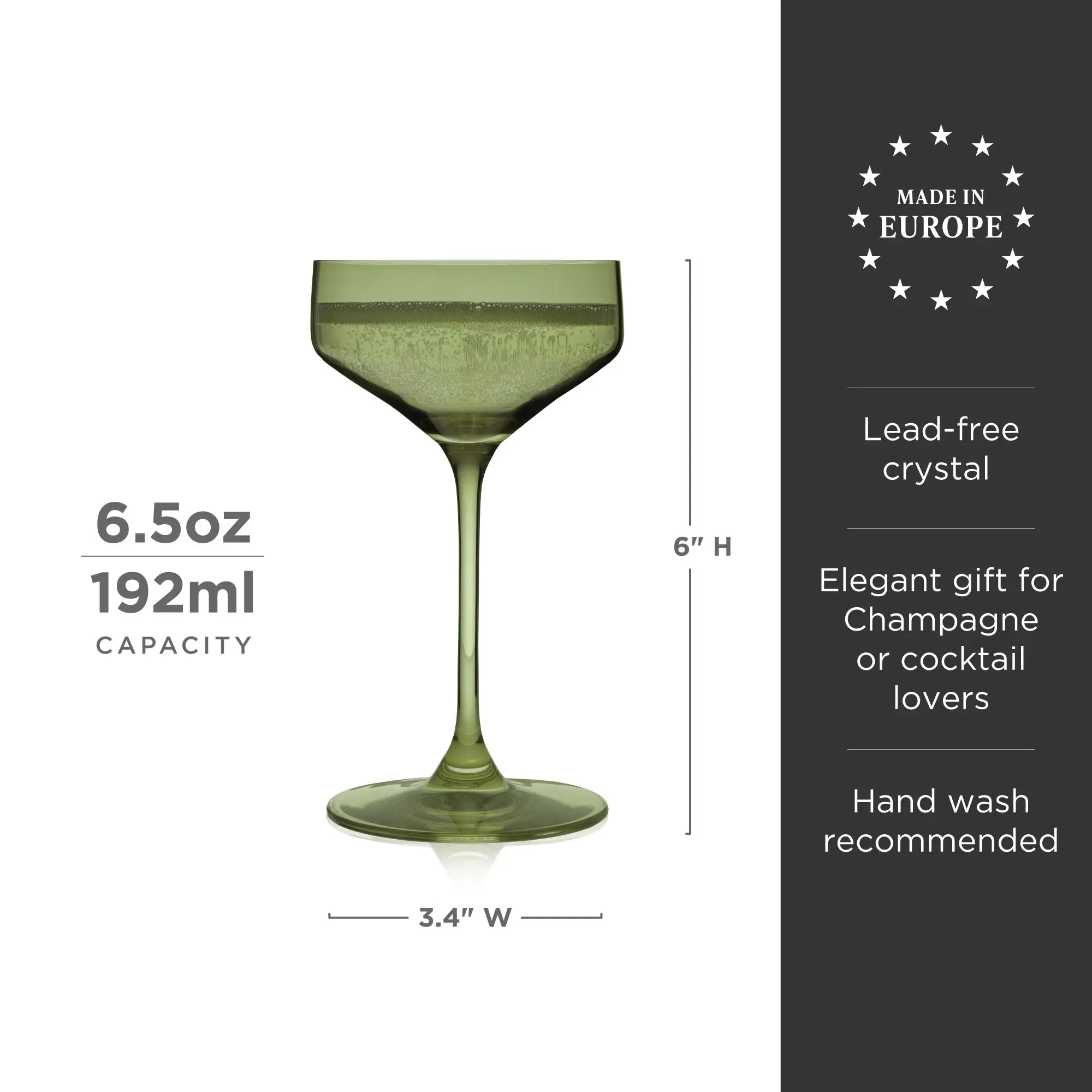 Crafted from European crystal with a gorgeous sage green hue, these coupe glasses bring a soft, lush tint to shaken cocktails. Add some color to your glassware collection with these stemmed cocktail glasses.