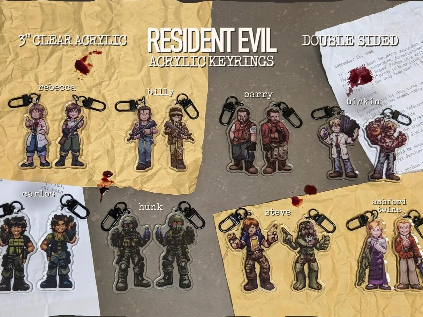 5. Resident Evil Side Character 3" Keychains || Rebecca, Billy, Barry, William Birkin, HUNK, Carlos, Steve, Ashfords