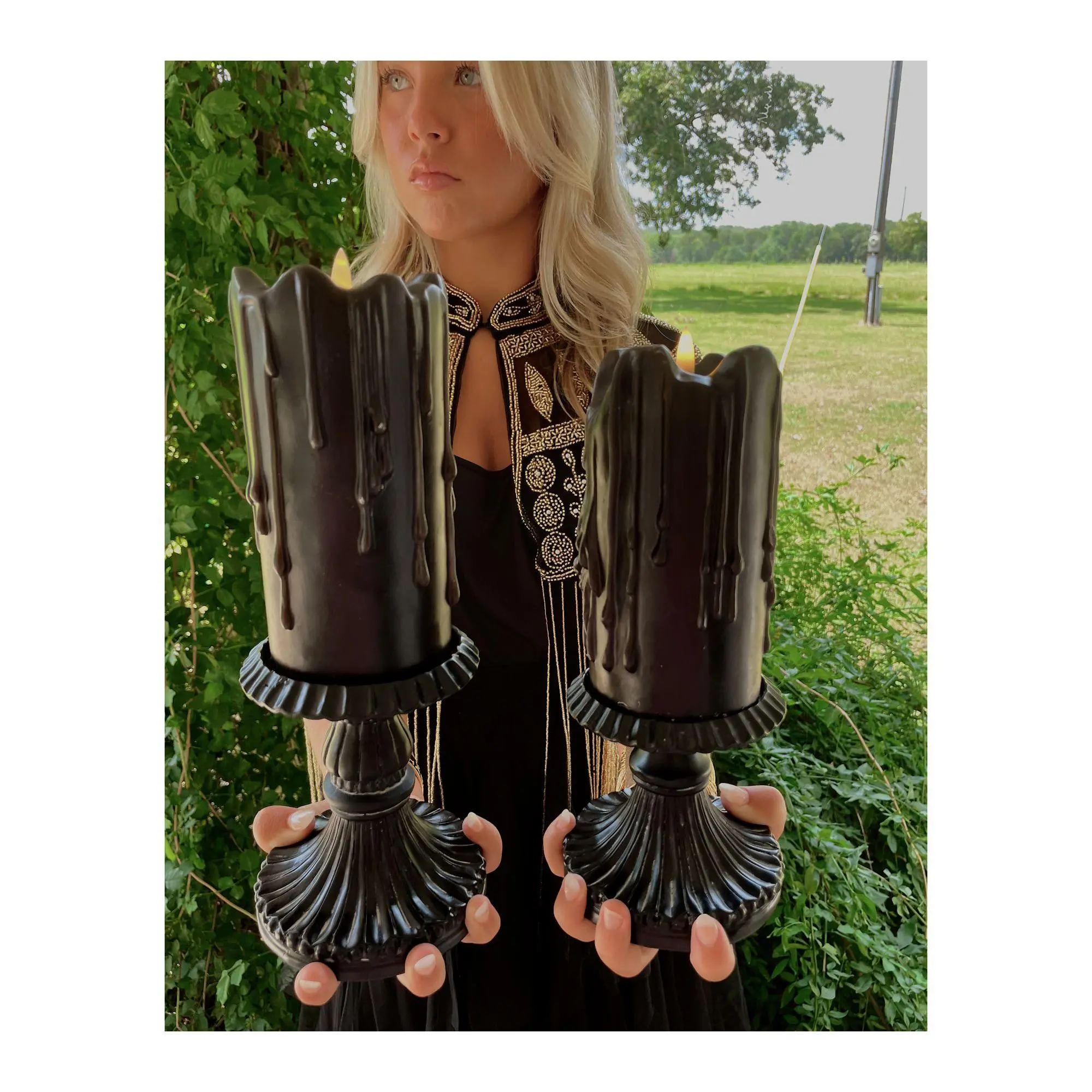 Spooky black flameless candles! Just requires batteries. Adds an extra spooky vibe to your Halloween decor. #halloween #halloweendecor #summerween #halloweendecorations #candle