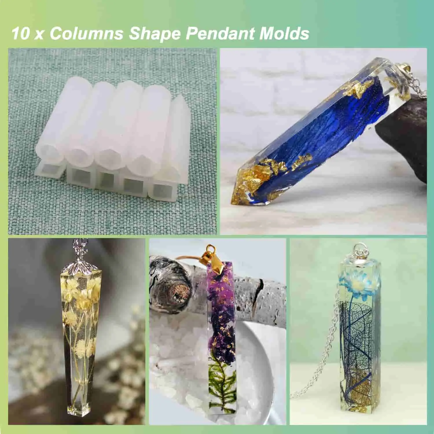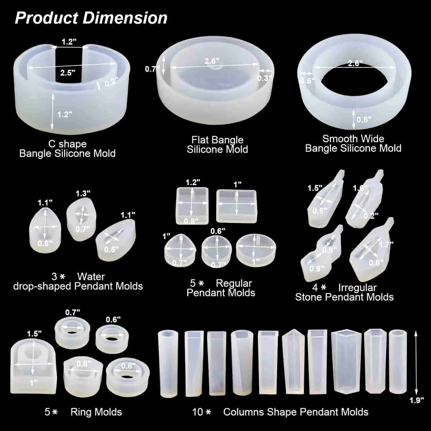 ·LET'S RESIN Resin Jewelry Kit for Starter: jewelry molds kit comes with 3 x resin bracelet Molds;10 x Columns Shape resin pendant Molds; 5 x regular pendant Molds;4 x irregular stone pendant Molds; 3 x water drop-shaped pendant molds; 5 x resin ring molds and 50 x screw eye pins. Great variety of jewelry resin molds to save your time and money, especially suitable for beginners who are new to resin crafts.