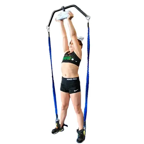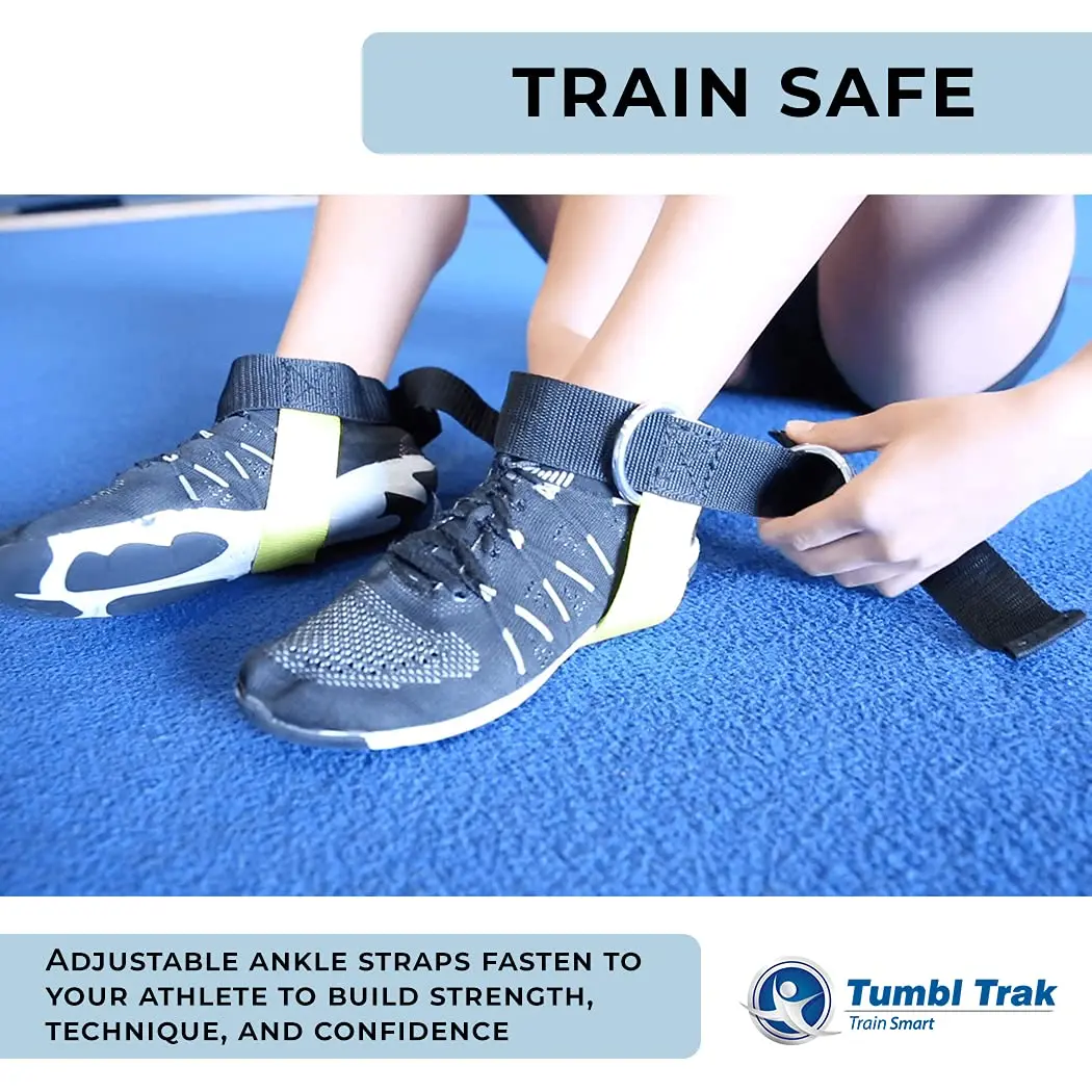 The Stunt Double includes a sturdy steel upper crossbar with a swivel foot, three bungees of varying lengths, and adjustable ankle straps. These components ensure durability and versatility. The shoe is not included. Trust Tumbl Trak for true cheer equipment.