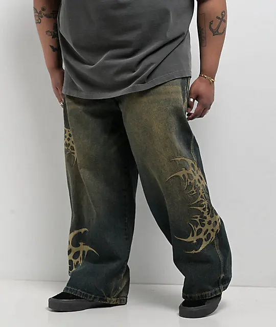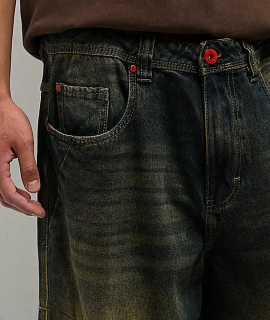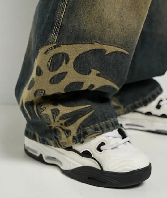 Add an edgy vibe to your outfit with the Respawn jeans from Vitriol in a unique blue wash colorway. These pants embrace an ultra-wide silhouette with embroidered cyber-sigilsim designs on both legs for a loud appearance. With blood-red embossed hardware for an additional flair, the Respawn jeans are finished with a five-pocket configuration, an internal drawstring waistband, and a leather brand patch on the back of the waistband, providing a cohesive look.
