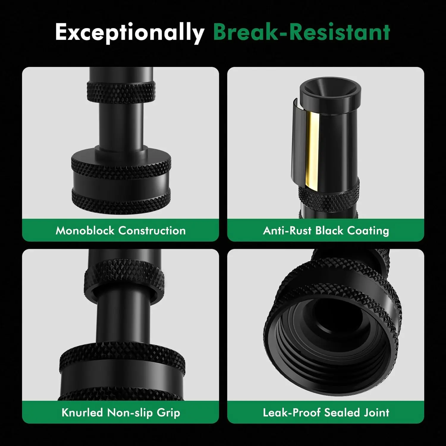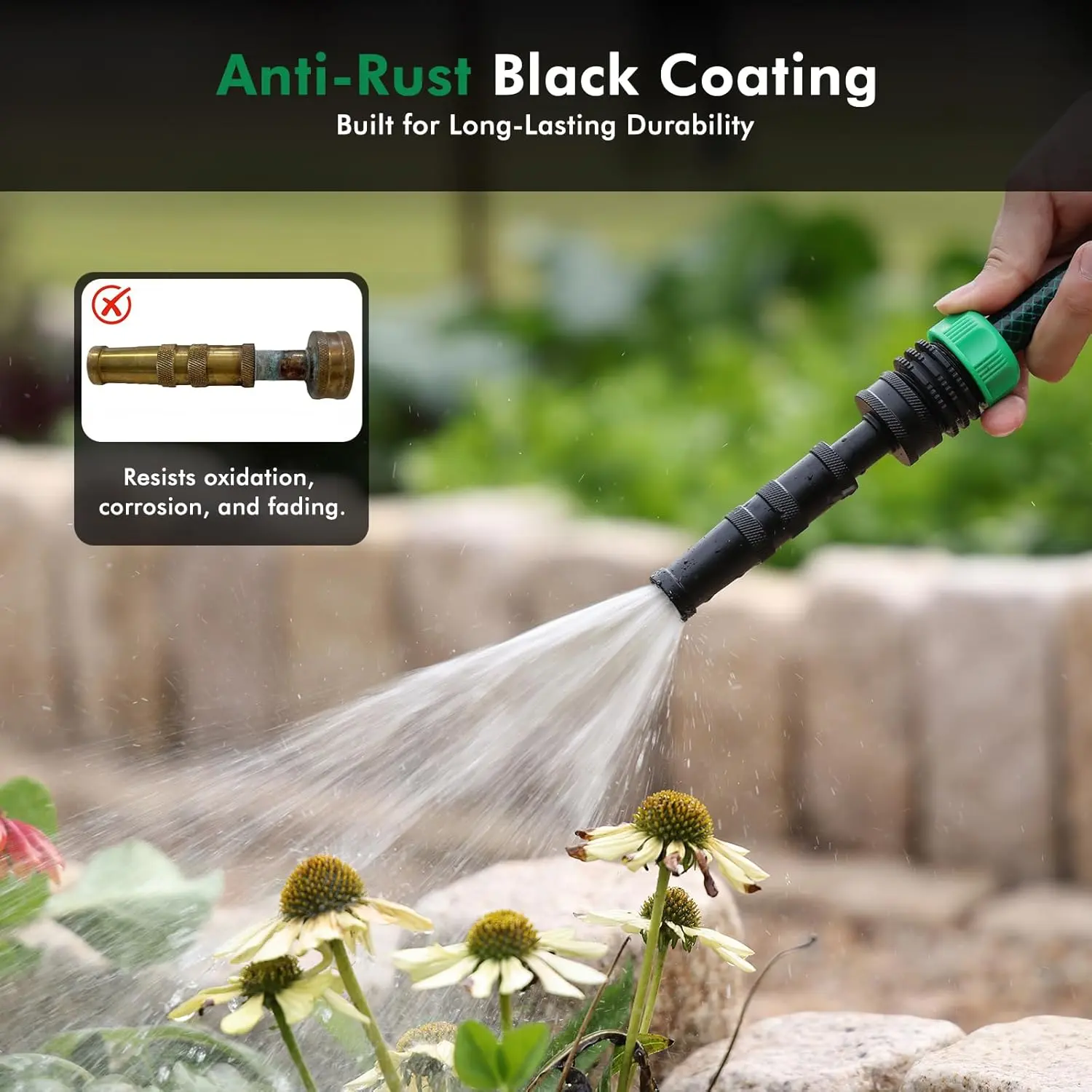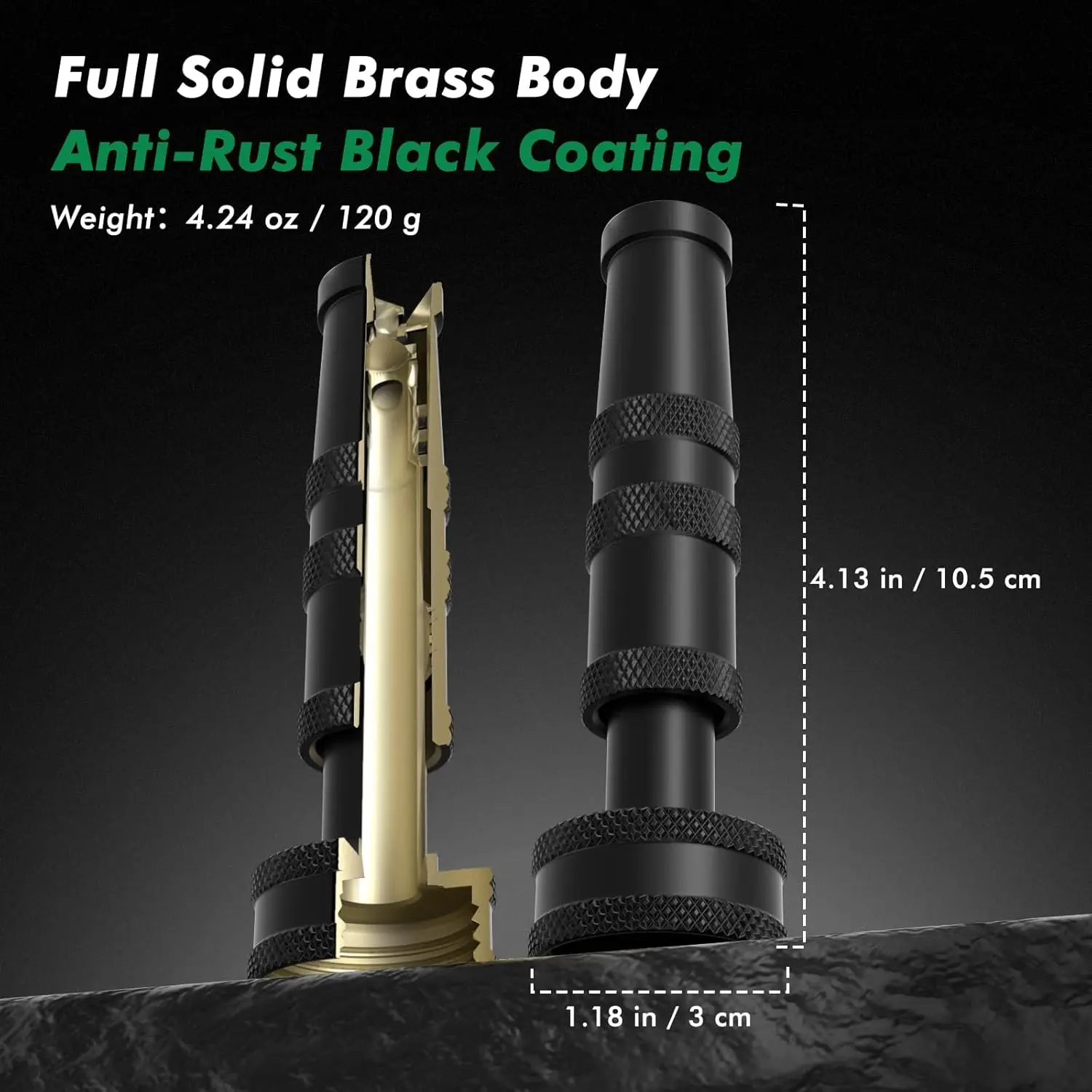 ·100% Solid Brass Construction with Superior Rust Resistance: This hose nozzle is made from solid brass and finished with a tough black anti-rust coating for long-lasting durability. The dual rust-resistant design prevents oxidation, corrosion, and discoloration. Featuring monoblock inlet and base construction, it avoids breakage issues common with aluminum nozzles. Sturdier and more reliable than plastic or aluminum alternatives, it performs well even in harsh outdoor conditions.