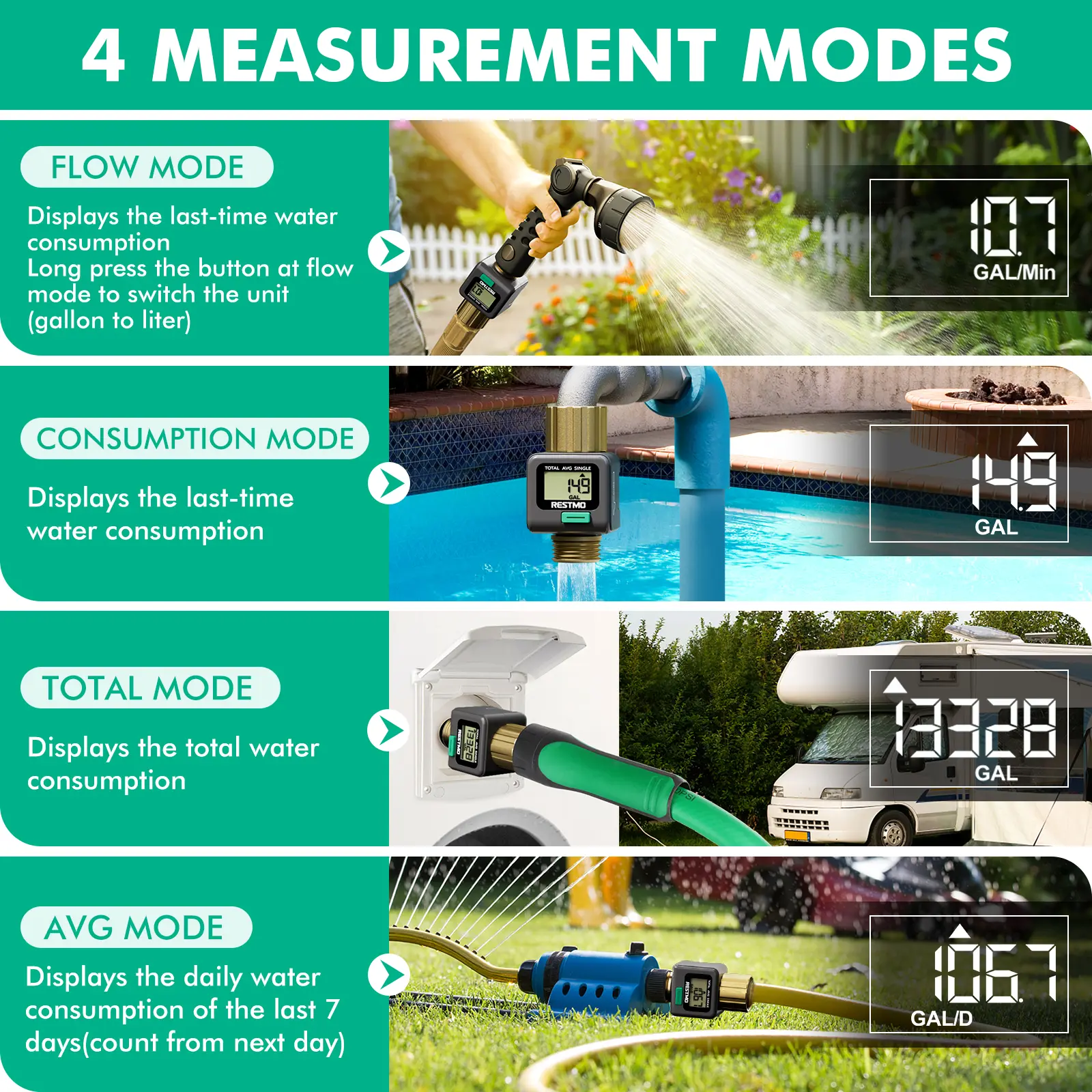 ·Short press the button to change the mode from FLOW / CONSUMPTION / AVERAGE / TOTAL. Flow Mode: real-time water flow rate | Consumption Mode: last-time water usage | Average Mode: daily average water usage of a week (count from next day) | Total Mode: total water usage.