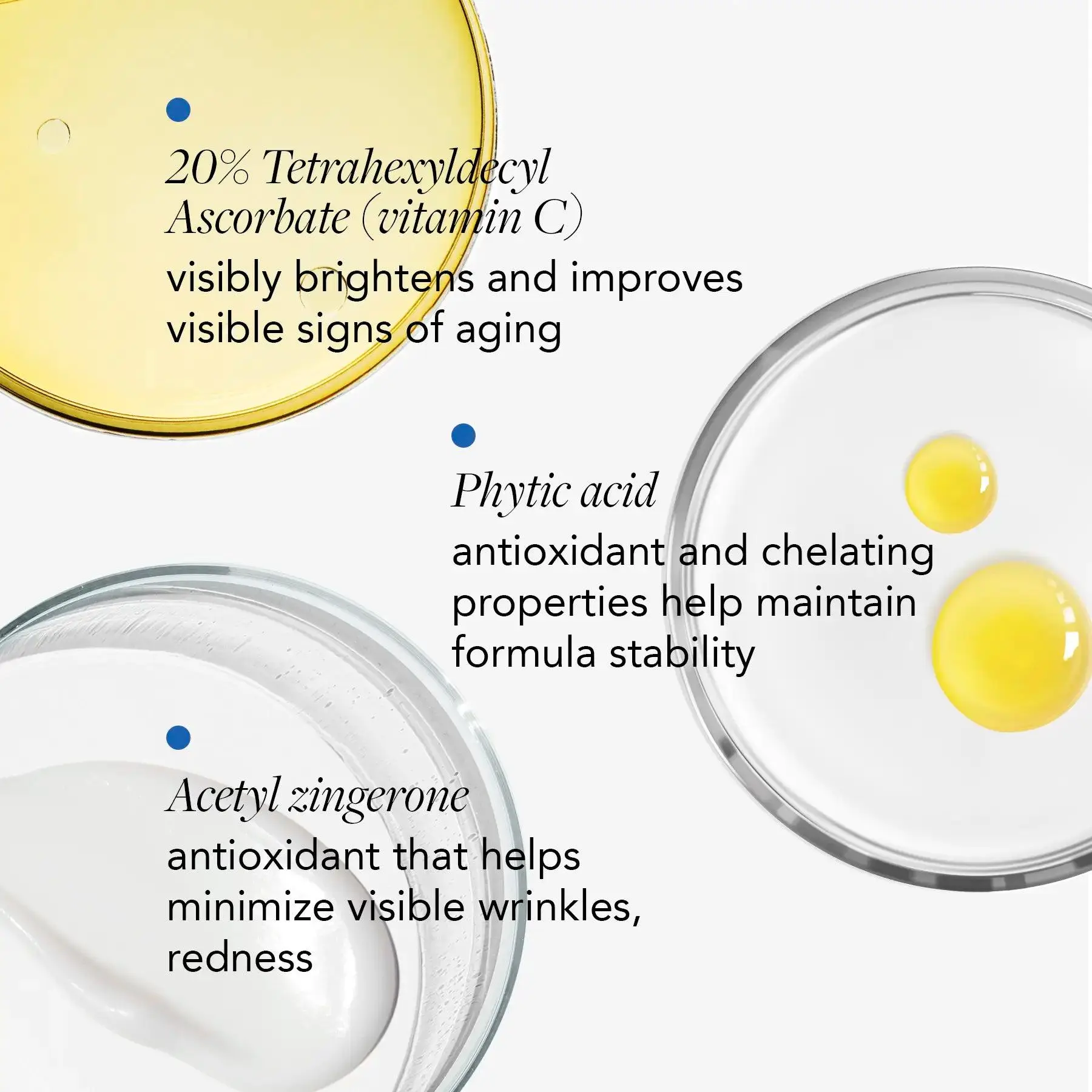 | Ingredients | AQUA/WATER/EAU,TETRAHEXYLDECYL ASCORBATE,PENTYLENE GLYCOL,ETHOXYDIGLYCOL,ACETYL ZINGERONE,GLYCERIN,TOCOPHEROL,PHENOXYETHANOL,SCLEROTIUM GUM,FERULIC ACID,POLYGLYCERYL-6 POLYRICINOLEATE,1,2-HEXANEDIOL,SODIUM HYALURONATE,ETHYLHEXYLGLYCERIN,LACTOBACILLUS/PORTULACA OLERACEA FERMENT EXTRACT,CITRUS AURANTIUM DULCIS (ORANGE) PEEL OIL,PELARGONIUM GRAVEOLENS (GERANIUM) FLOWER OIL,LIMONENE,CITRONELLOL,GERANIOL,LINALOOL,LEUCONOSTOC/RADISH ROOT FERMENT FILTRATE,LACTOBACILLUS,COCOS NUCIFERA (COCONUT) FRUIT EXTRACT. |